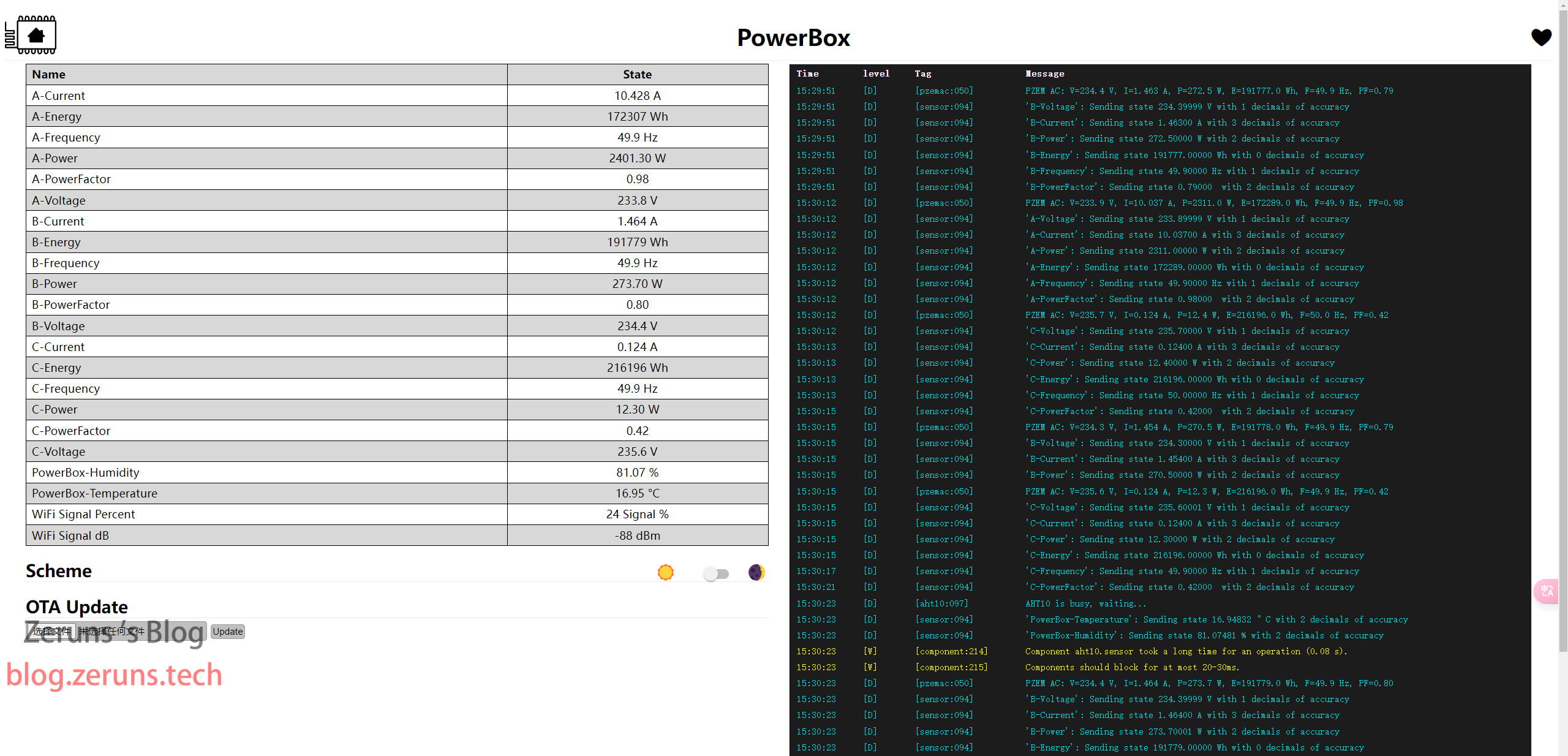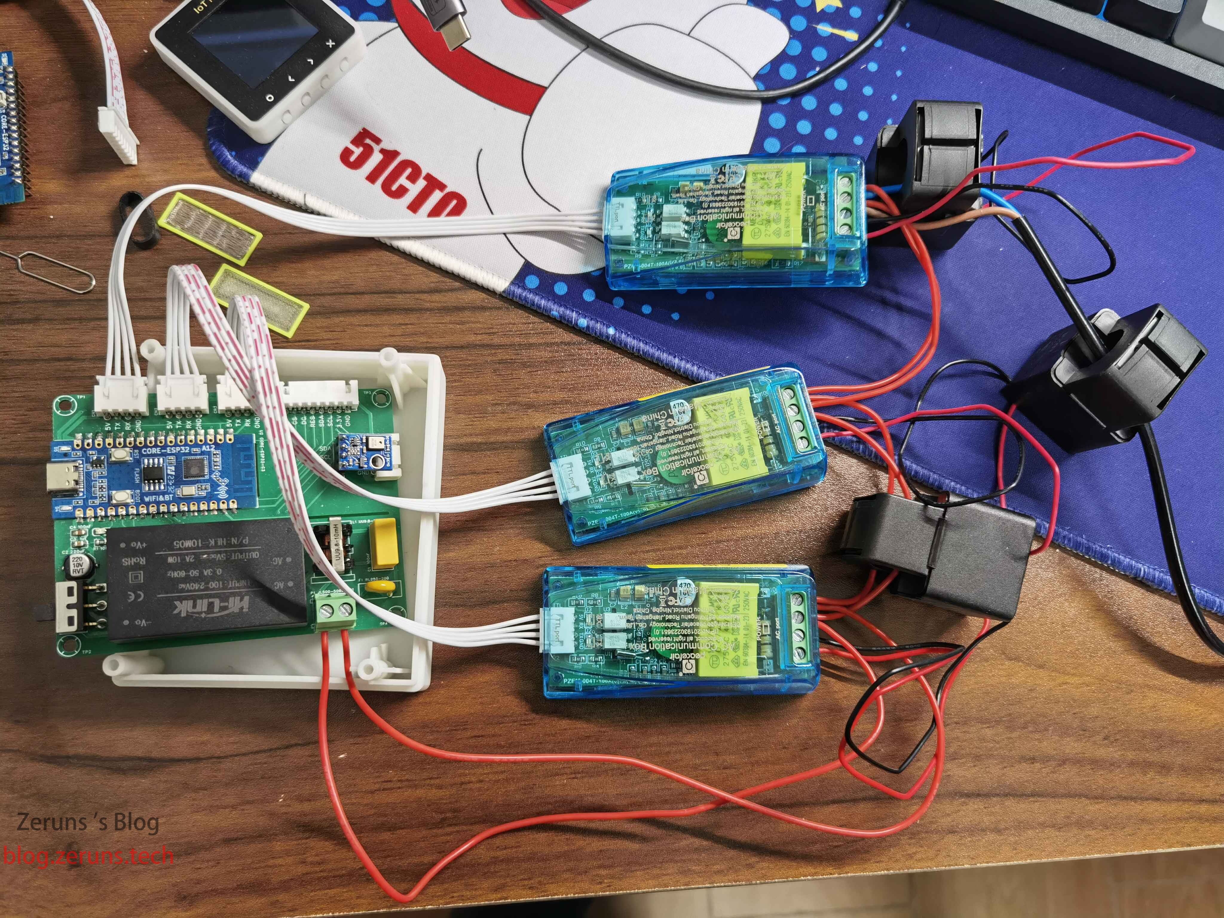 Для измерений используются 3 датчика параметров PZEM004T, которые по UART связываются с ESP32-C3; далее по Wi-Fi данные отправляются в HomeAssistant (сервер поднят мной на Raspberry Pi 4), прошивка ESP32-C3 написана в ESPHome.