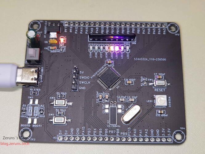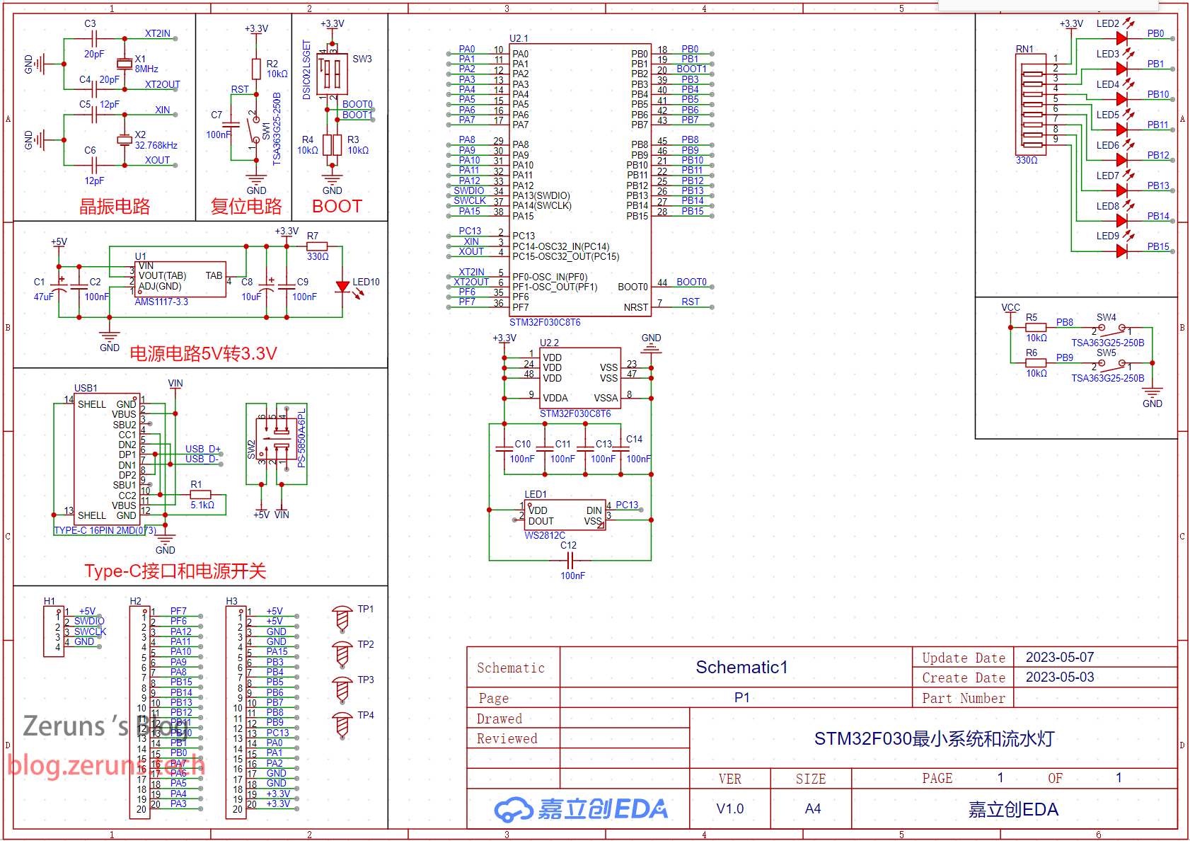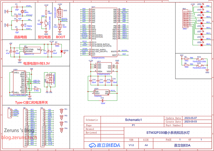 开源链接:https://oshwhub.com/zeruns/stm32f030-zui-xiao-xi-tong-he-liu-shui-deng/