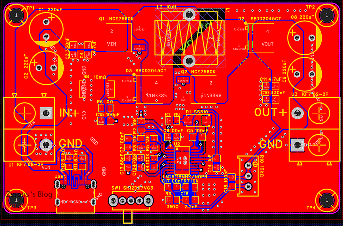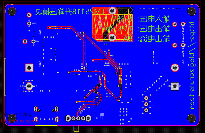 电感我也换成了6.8μH的了。还有就是下面实物图中的LM25118芯片的2脚UVLO因为画原理图时那根线没连上,所以飞了根线上去,下面的PCB图和原理图都已修正了。