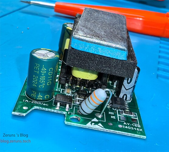 把电路板取出,变压器上面有一个配重铁块。这个电源应该是反激式的开关电源。