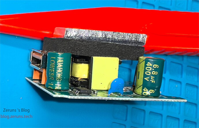 侧面,可以看到交流输入侧的滤波电容为400V 6.8μF的,容量偏小,Y电容为2.2nF的。