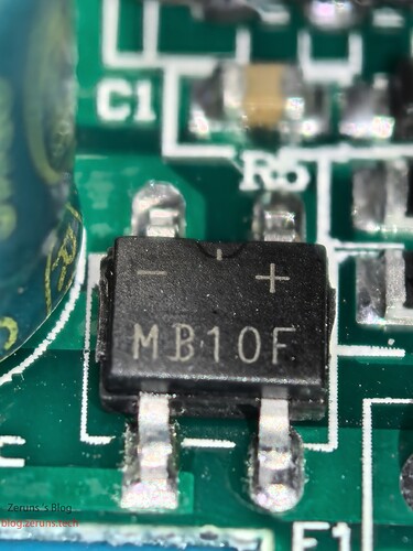 整流桥型号为MB10F,性能参数为1000V/1A。