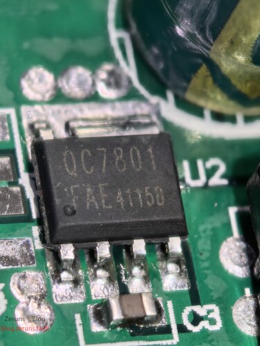 输出端有一个型号为QC7801/FAE41150的芯片,也是查不到资料,应该是一个MOS管。
