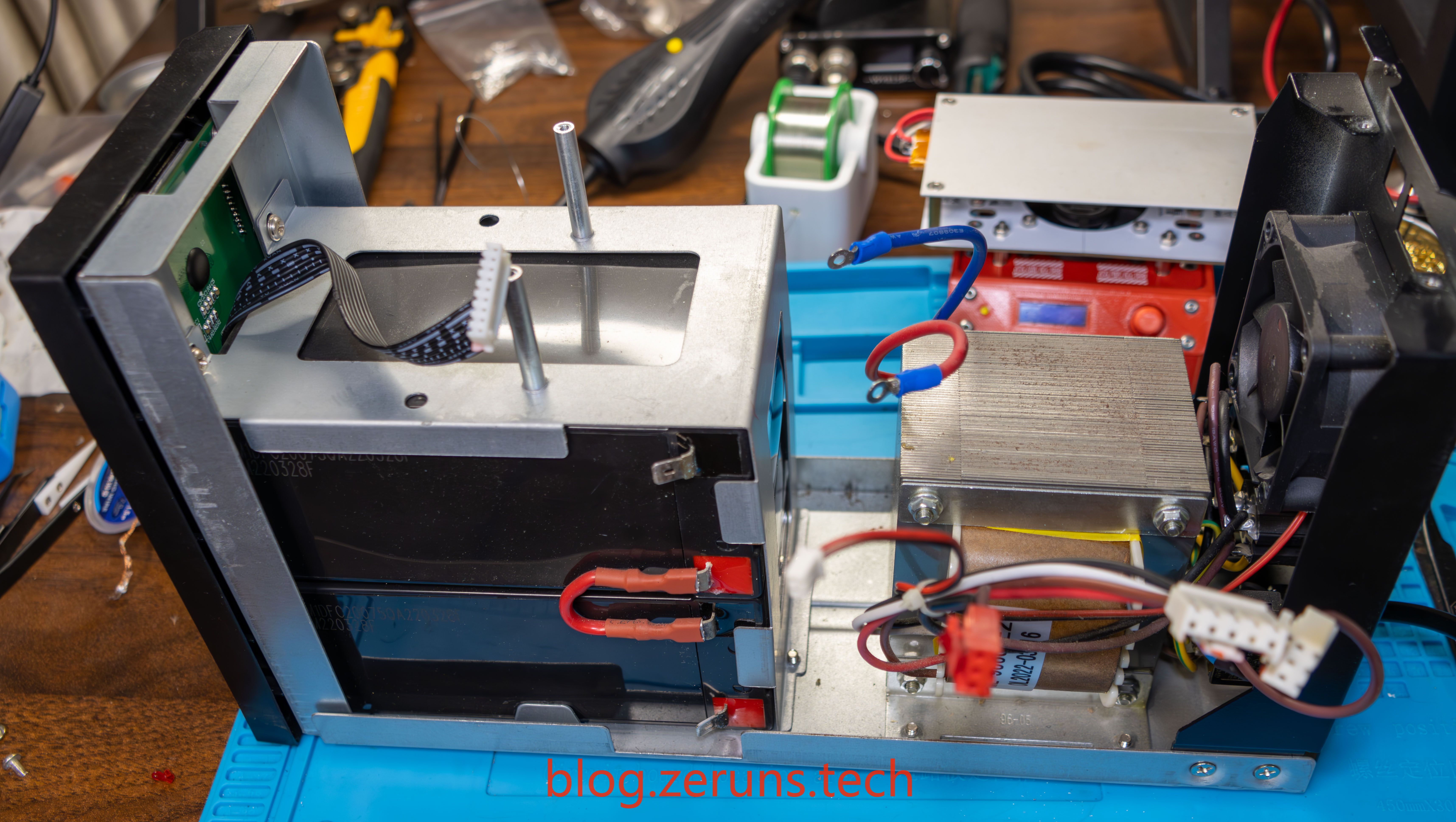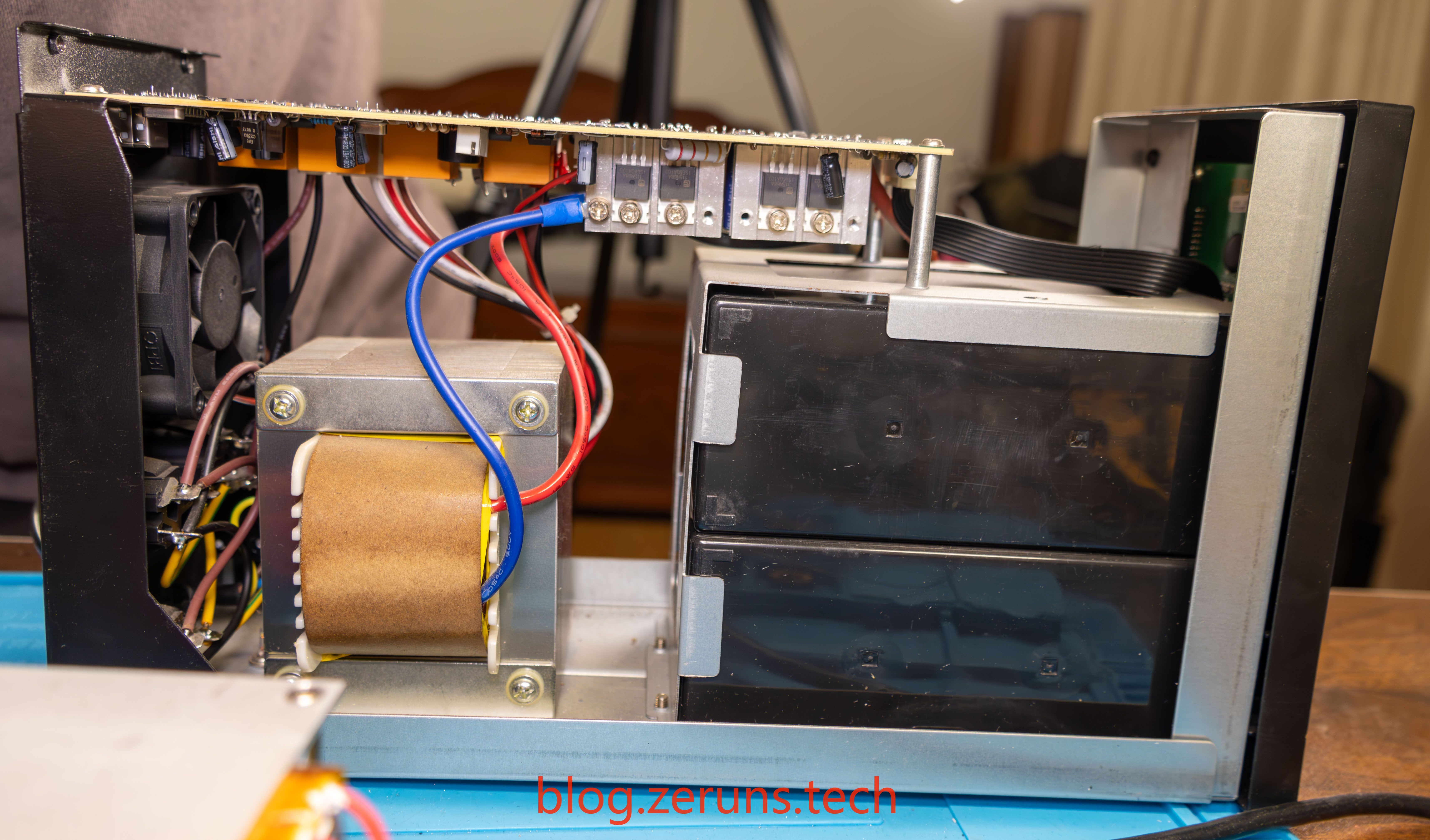 Боковая сторона после открытия крышки. Внизу находится трансформатор и две свинцово-кислотные батареи 12V9AH, батареи соединены последовательно, сверху находится печатная плата.