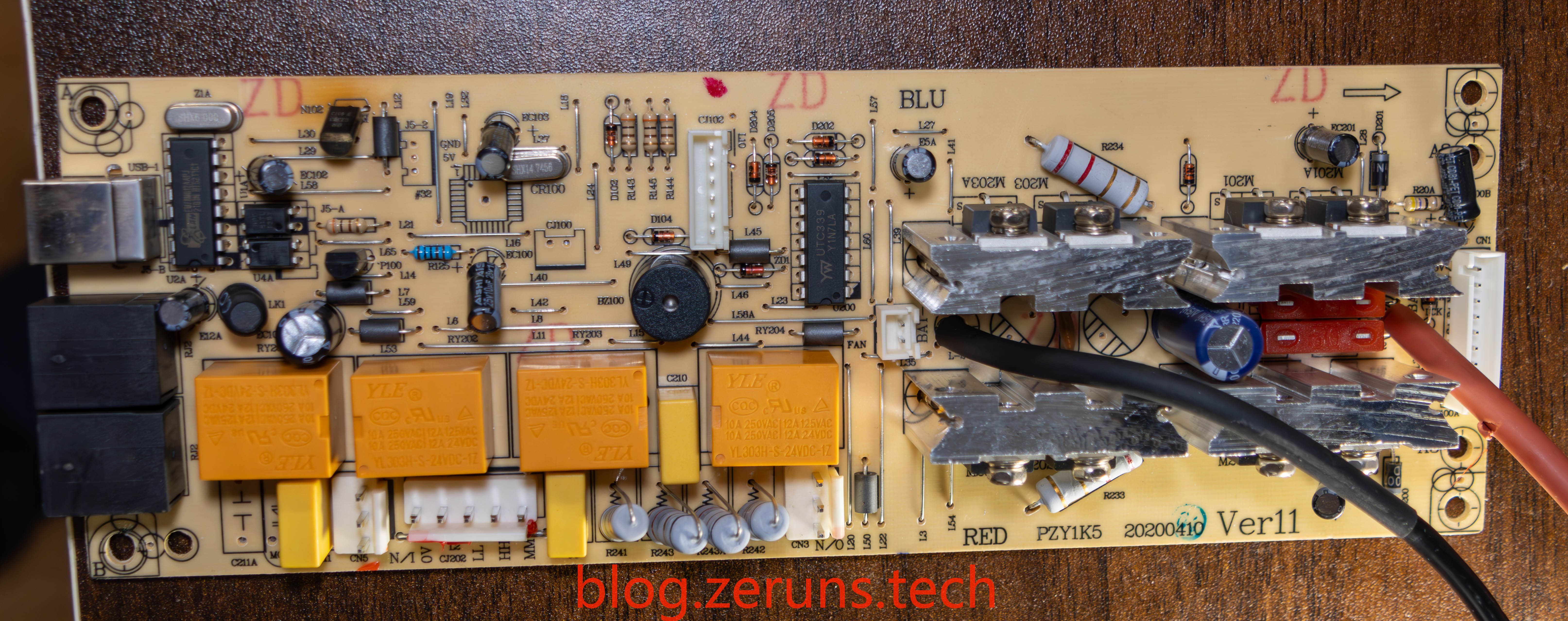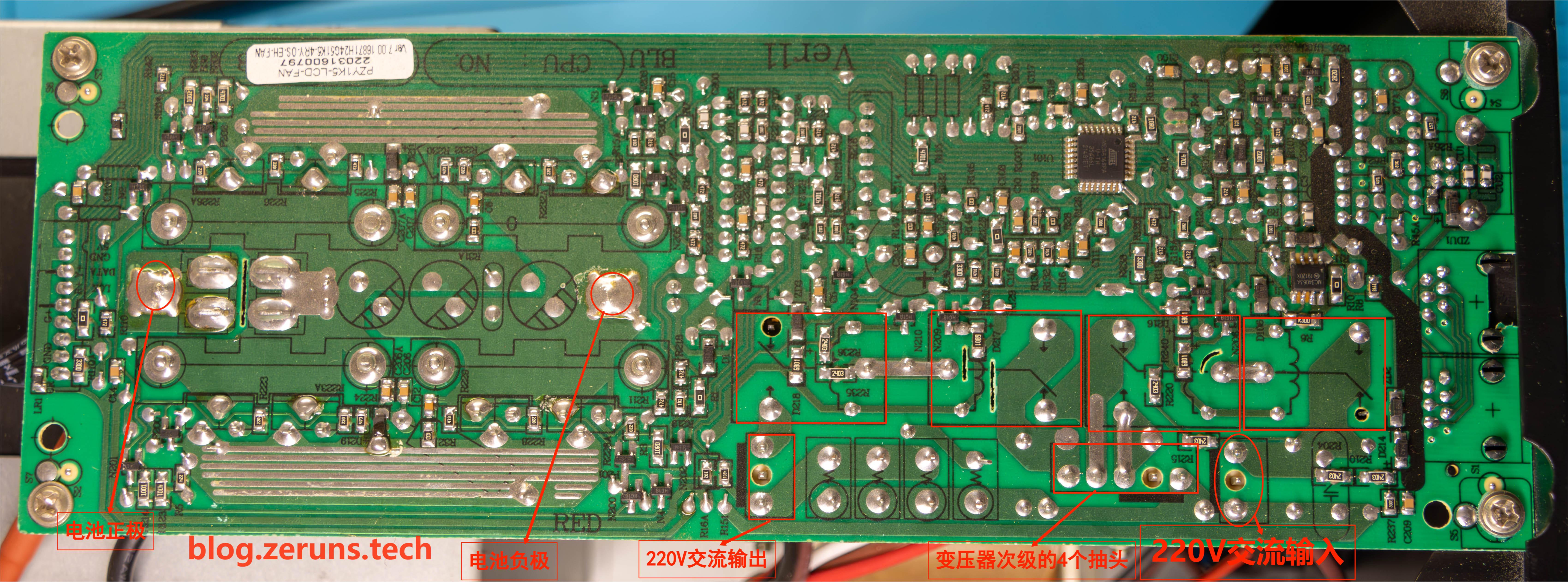 Вторичная обмотка этого сетевого инвертора имеет 4 отвода, которые через управление 4 реле реализуют функции: прямой выход сетевого питания, зарядка батареи от сети, выход инвертора от батареи и т.д. Разводку можно посмотреть на фотографиях печатной платы ниже, я отметил все интерфейсы.