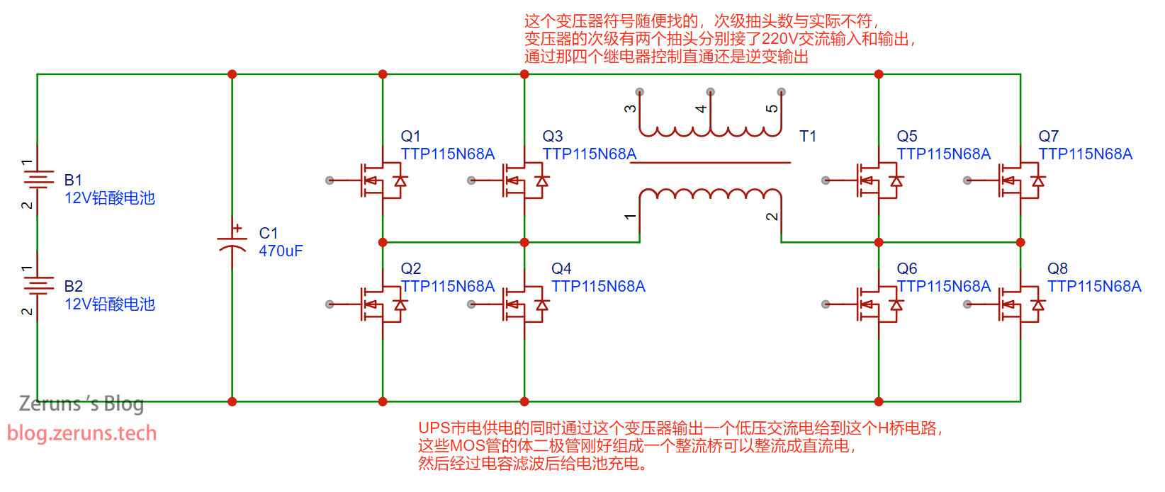 Когда ИБП питается от сети, через этот сетевой трансформатор выводится низковольтный переменный ток на мост H (в этот момент первичная и вторичная обмотки трансформатора как бы поменялись местами), телесные диоды МОП-транзисторов моста H образуют выпрямительный мост, который выпрямляет ток в постоянный, затем после фильтрации конденсатором заряжает батарею.