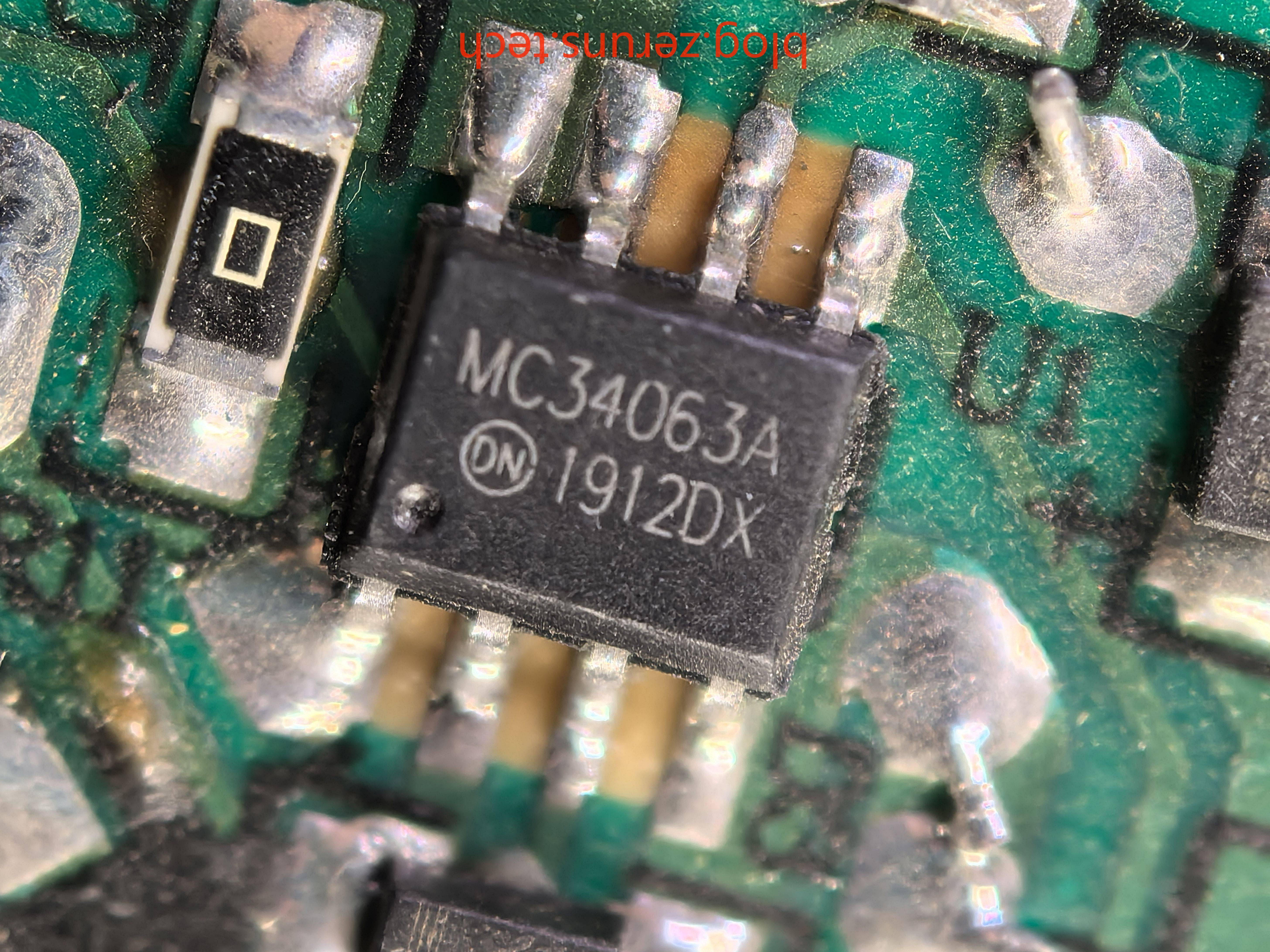 Рядом находится микросхема DC-DC понижающего преобразователя MC34063A, которая, вероятно, питает микроконтроллер и реле.