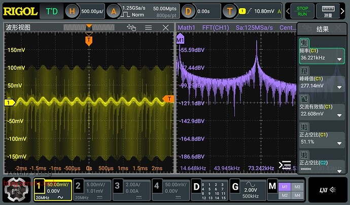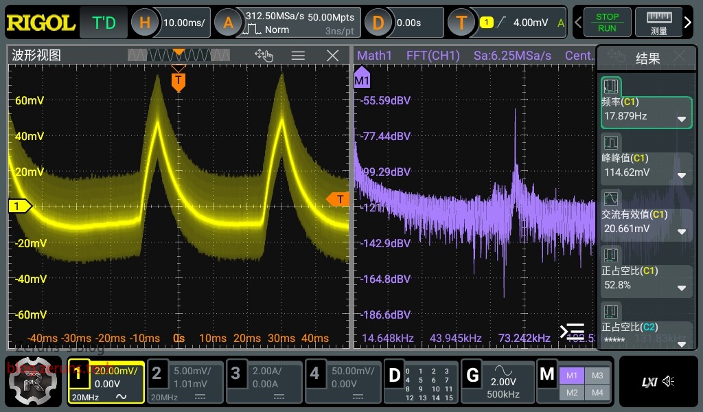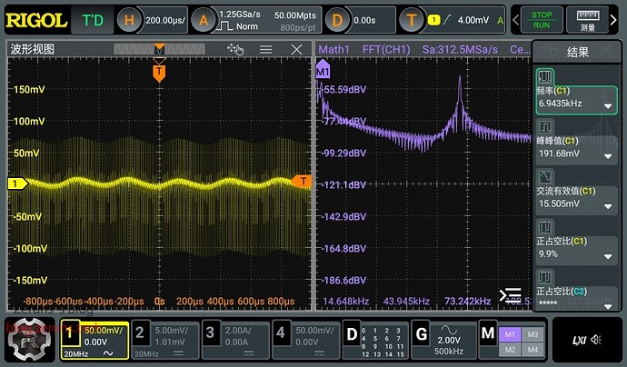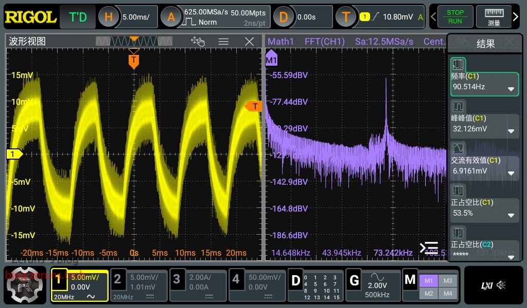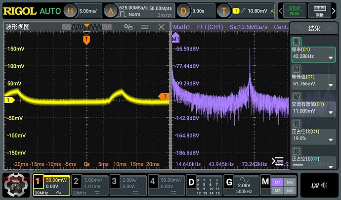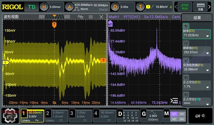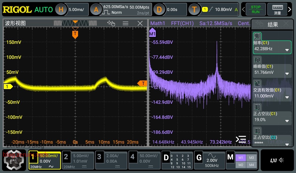 输出12V10A空载时的纹波峰峰值在191mV左右: