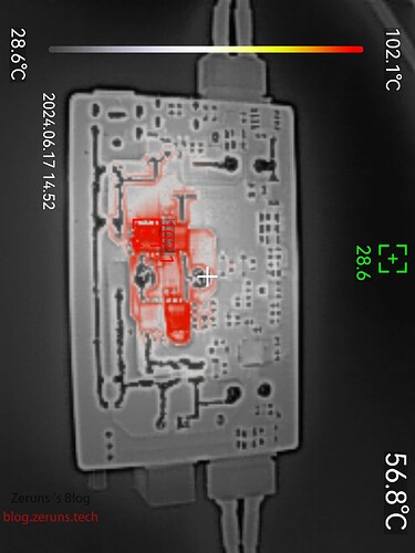 输出10A电流10分钟后的模块热成像图像,MOS管温度在100度左右,保险丝和保险座的接触电阻可能大了一点,所以保险丝那发热也有点大: