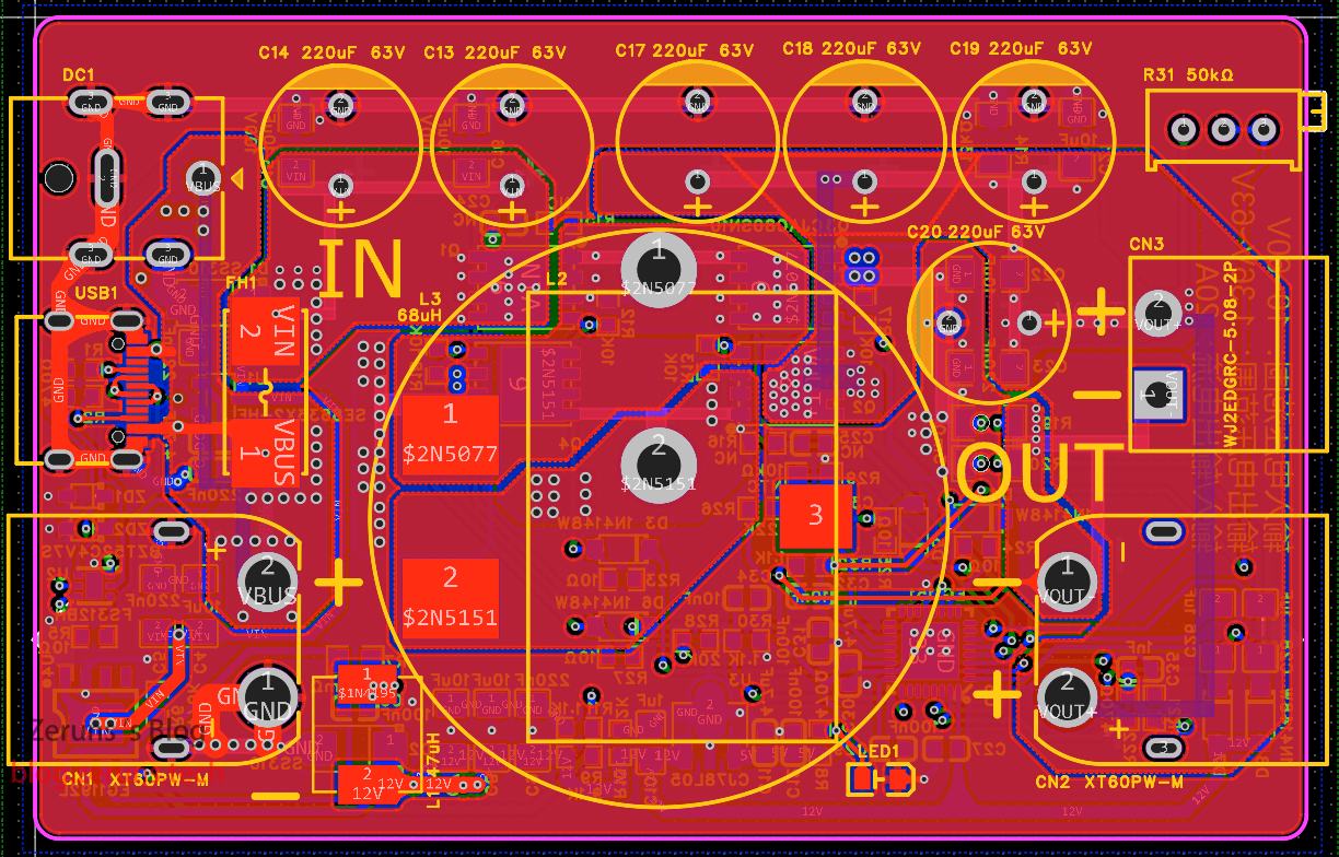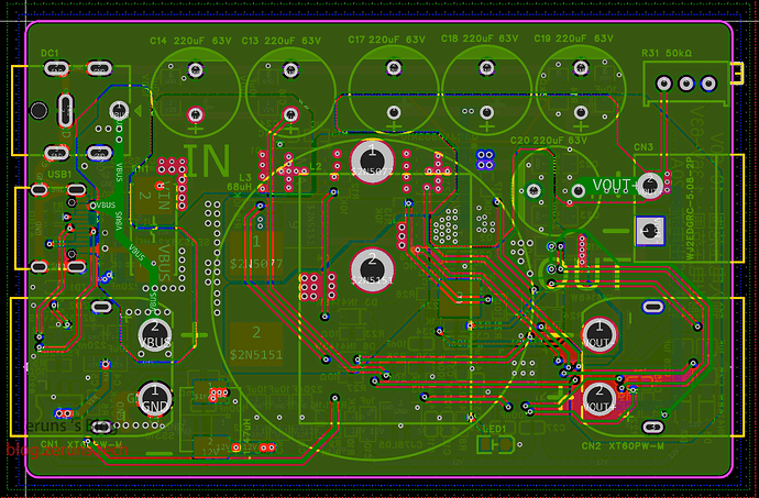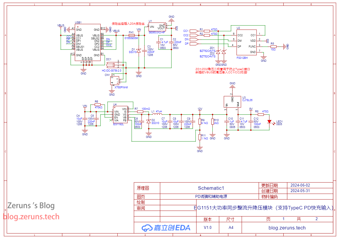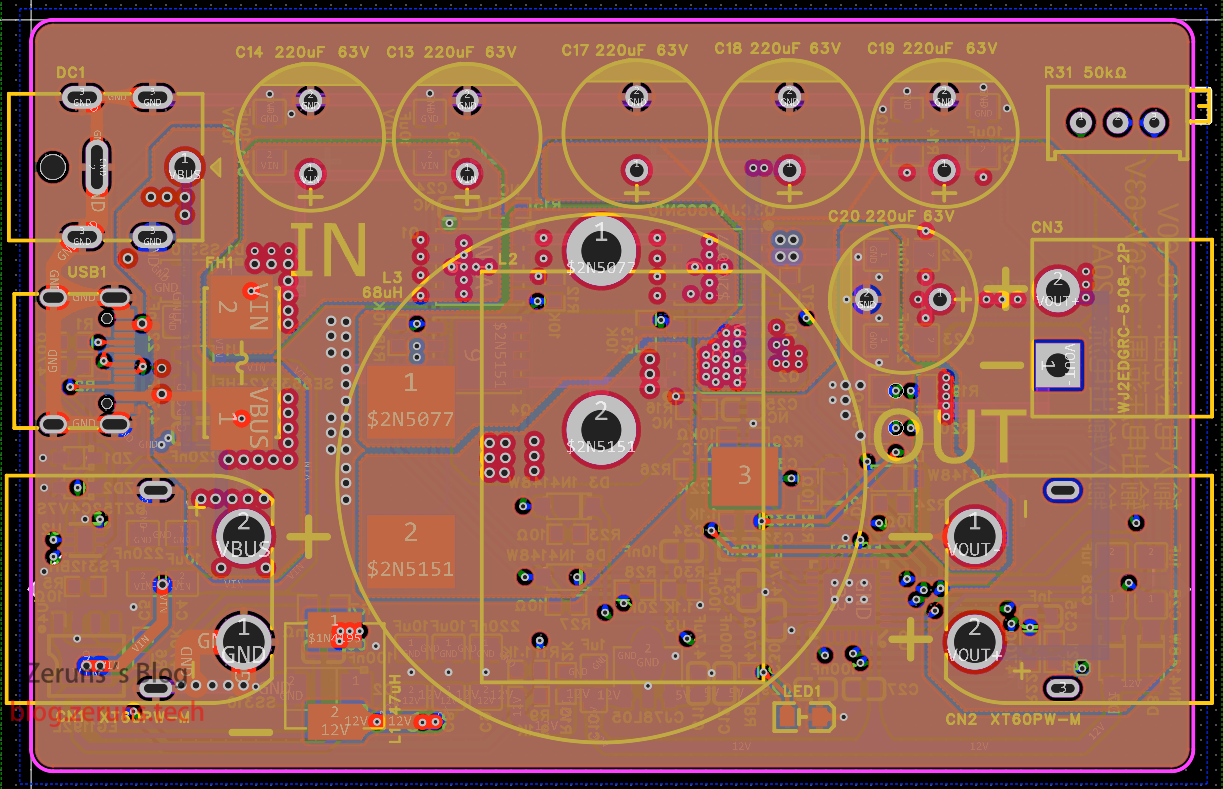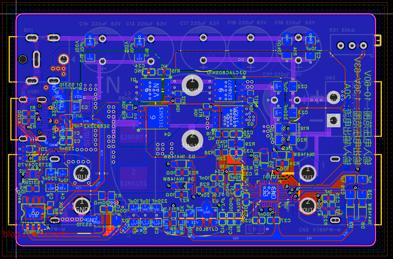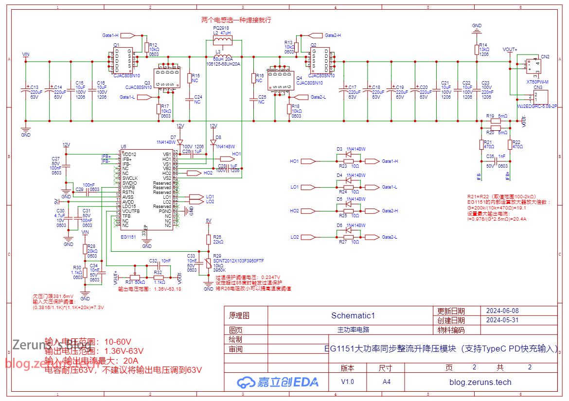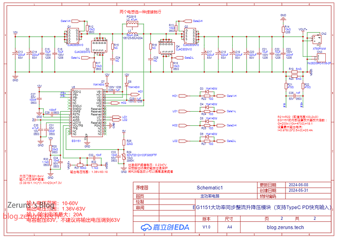 开源一款全国产的基于EG1151芯片的大功率可调升降压DCDC电源模块,支持TypeC接口输入,带PD3.1诱骗最高支持48V,还有XT60和DC5.5接口输入,最高输入/输出电压63V,最大输入/输出电流20A,支持过流保护和过温保护,最高效率96.8%。