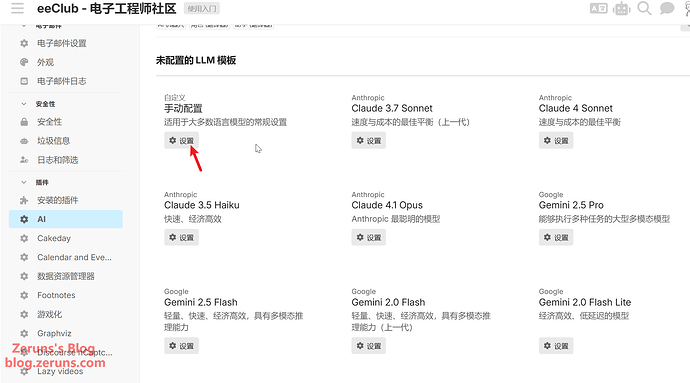 进入AI插件的【设置】页面,点击【LLM】,滑到下面的【未配置的 LLM 模板】,点击【自定义-手动配置】下面的【设置】。