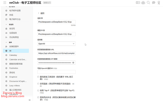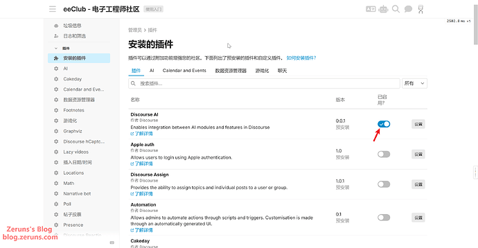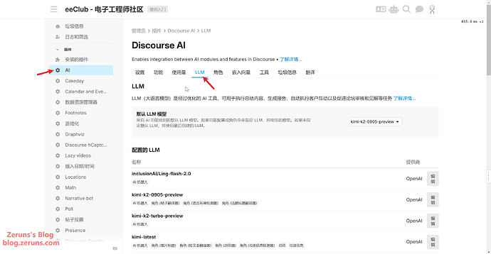 在【Discourse后台】启用【Discourse AI】插件,必须要先启用插件才会出现LLM模型设置项。