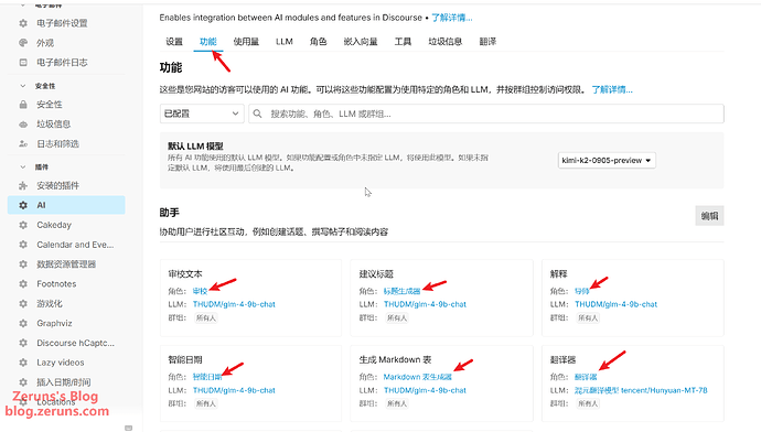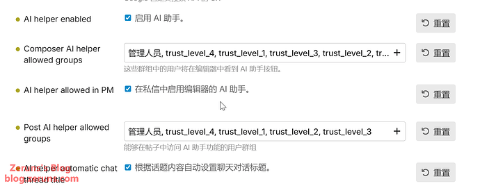 滑到下面的 AI helper enabled 设置项可以启用AI助手,下面还可以设置哪些用户组有权限使用,这个AI助手是在发布话题的编辑框后辅助编辑,比如 翻译内容、校对文本、生成Markdown表格、生成标题 等等。