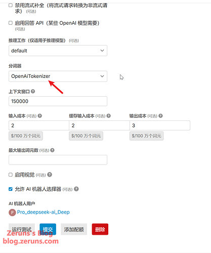 【分词器】一般选 OpenAiTokenizer 就可以,【上下文窗口】在模型介绍页面有写,比如我选的这个模型是160K,你就输入160000,设置好后点击【提交】,再点击【运行测试】看看有没有问题。