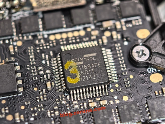 The circuit board under the GPS antenna is the three-phase sensorless BLDC (Brushless DC Motor) driver board. The chip model in the middle of the circuit board is SPC1168APE48, a highly integrated System-on-Chip (SoC) microcontroller from SPINTROL, which is supposed to be used for motor control, regulating the surrounding MOSFETs to drive the motors.