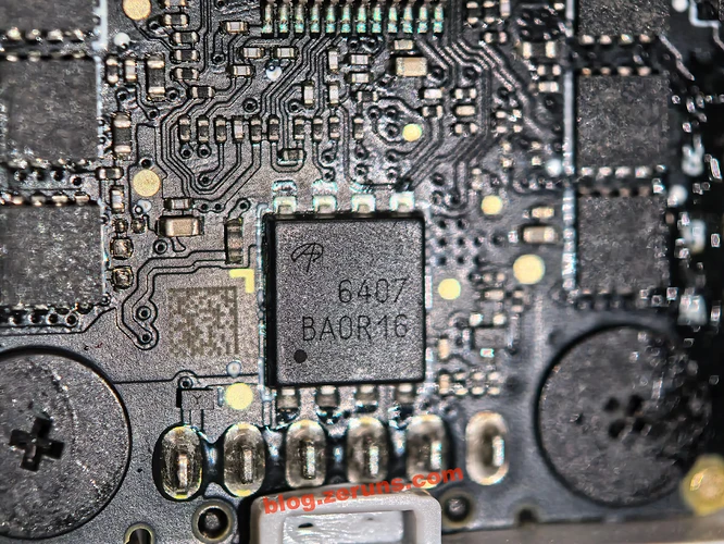 There are 4 groups of MOSFET chips (3 chips per group) around the motor driver board, corresponding to the motors of the four rotors. The MOSFET model is AON7934, a dual N-channel MOSFET from Alpha and Omega Semiconductor Limited (AOS), with two NMOS in a single chip forming a half-bridge.
