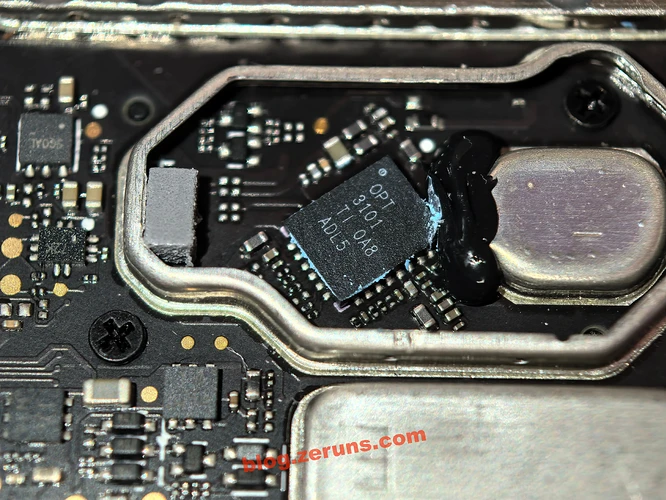 Remove the shield under the TF card slot (the other side of the circuit board at this position is the downward-facing camera module), and there is an OPT3101 chip from Texas Instruments (TI) inside.