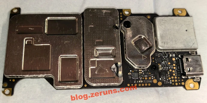 After removing the heatsink, the shield and some chips are coated with blue thermal grease.