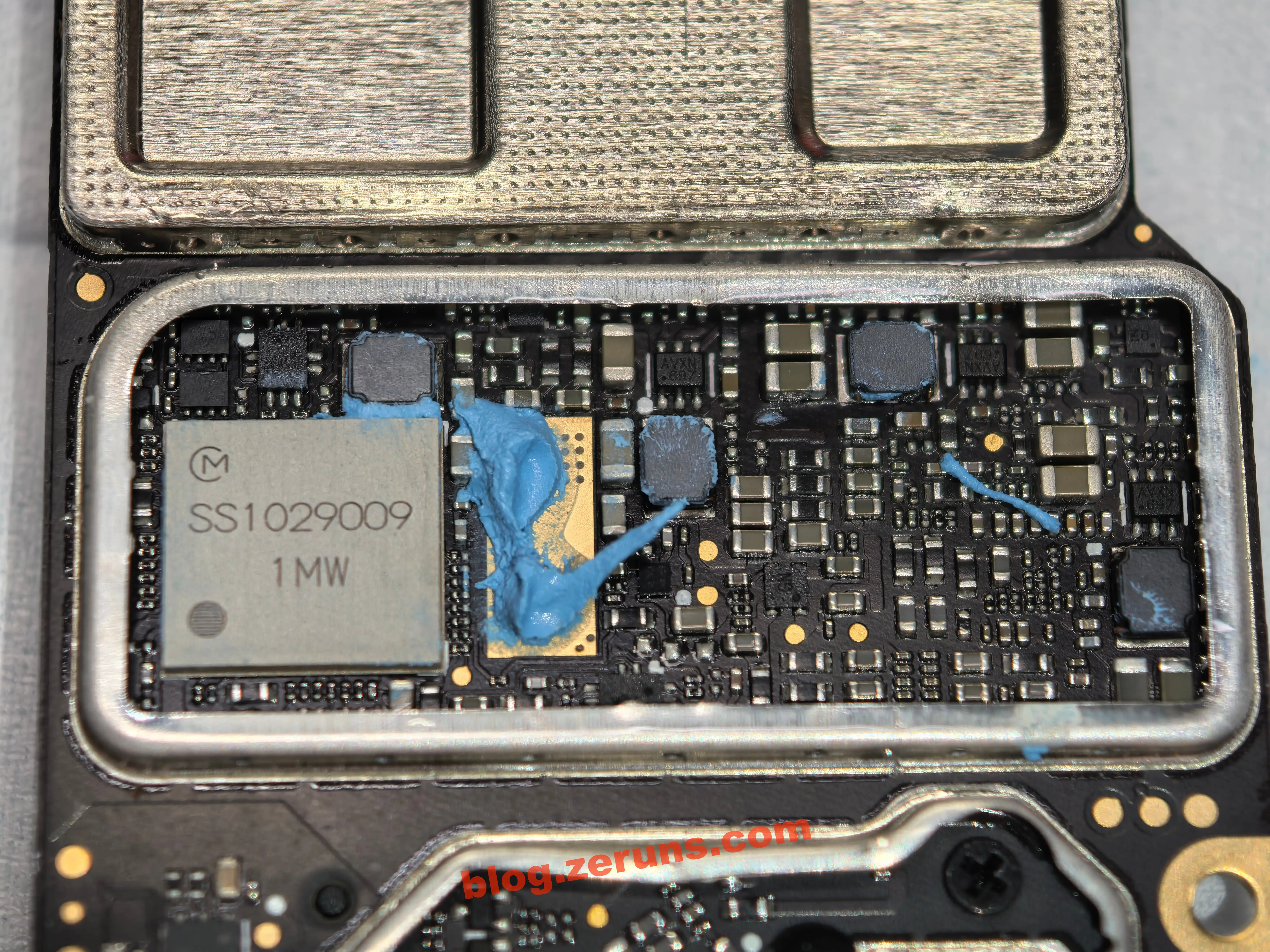 После снятия радиатора экран и некоторые чипы покрыты синей термопастой.