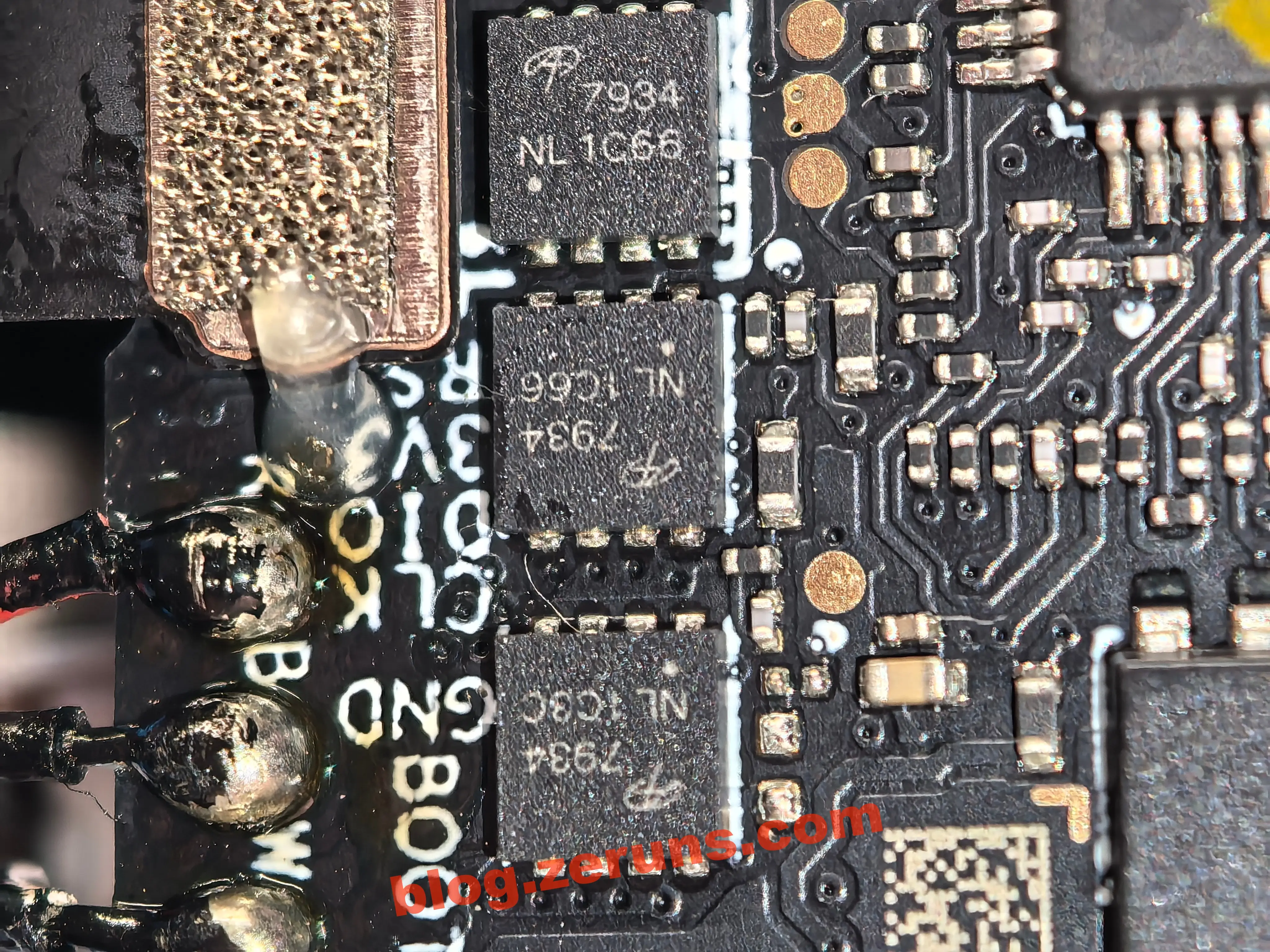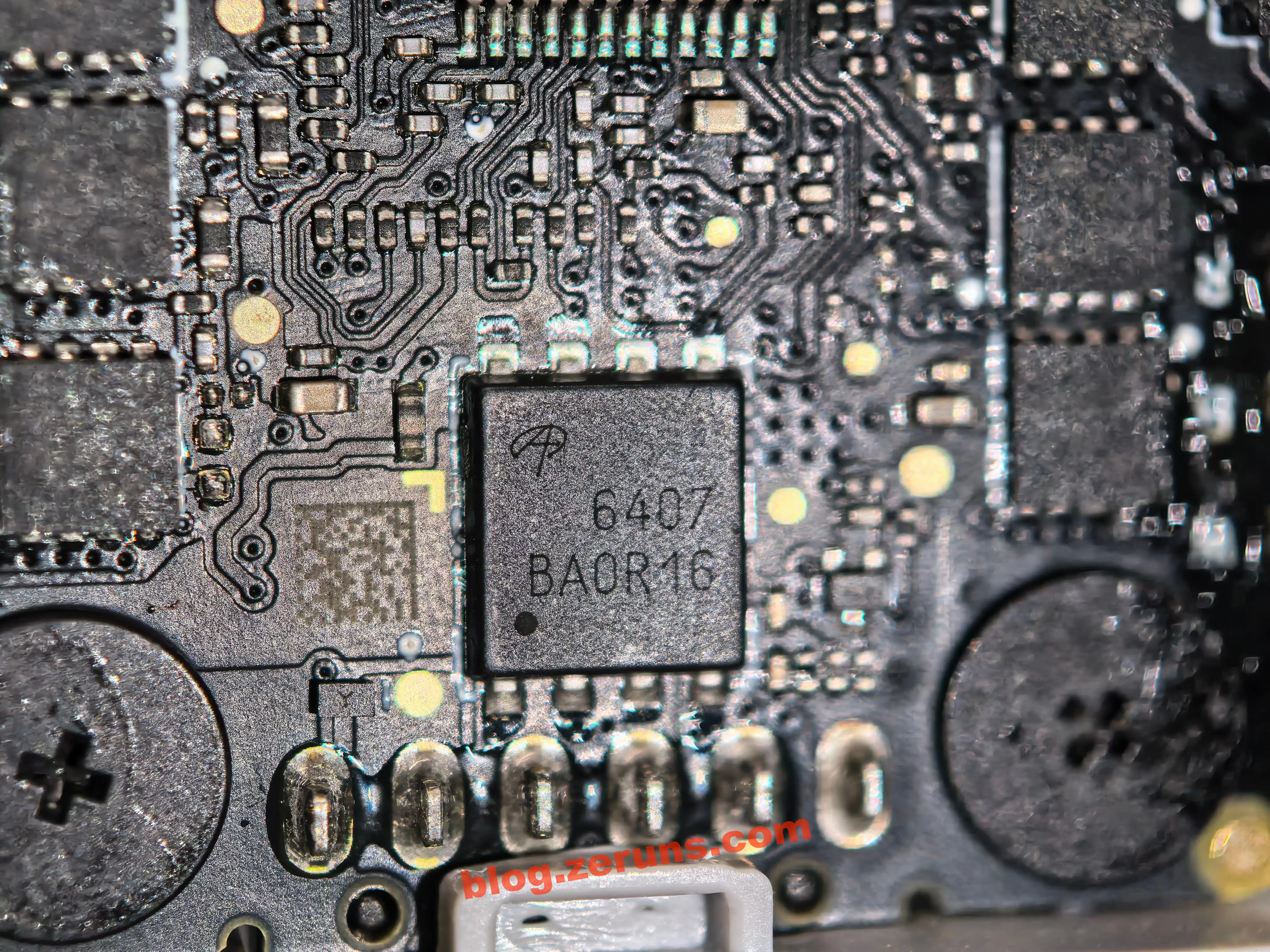 Вокруг платы драйвера двигателя есть 4 группы чипов MOSFET (по 3 чипа в группе), соответствующих двигателям четырех роторов. Модель MOSFET — AON7934, двойной N-канальный MOSFET от Alpha and Omega Semiconductor Limited (AOS), с двумя NMOS в одном чипе, образующими полумост.