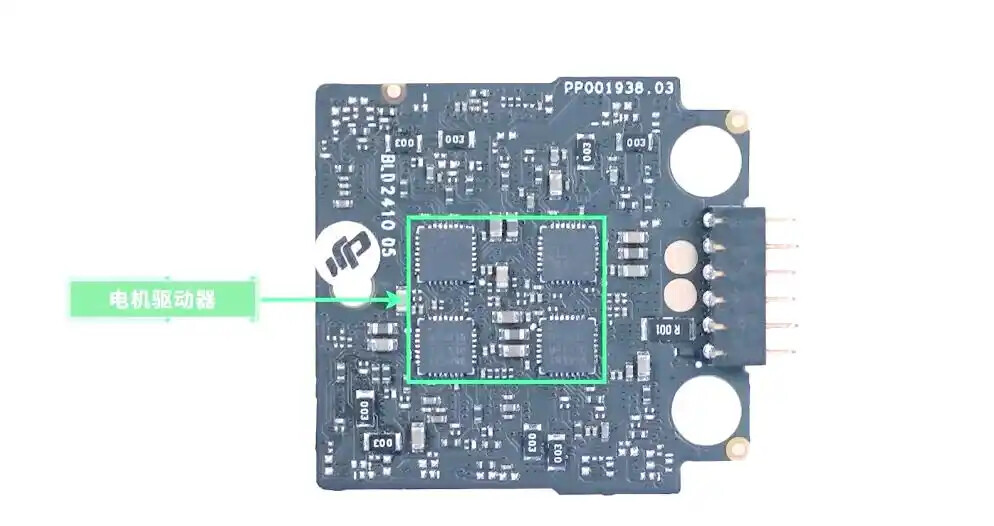 Плата под антенной GPS — это плата драйвера бесщеточного двигателя (BLDC) без датчиков. Среди чипов на плате находится модель SPC1168APE48, высококомплексный микроконтроллер на кристалле (SoC) от SPINTROL, который используется для управления двигателем и регулирования окружающих MOSFET для привода двигателей.
