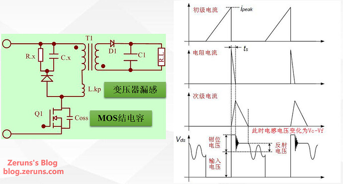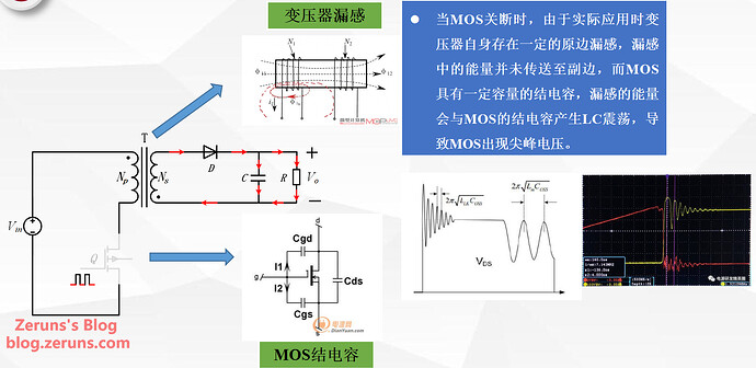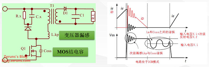 - When the MOSFET turns off, the primary leakage inductance of the transformer stores energy that is not transferred to the secondary side. This energy resonates with the MOSFET’s junction capacitance, creating an LC resonance that causes a voltage spike on the MOSFET.