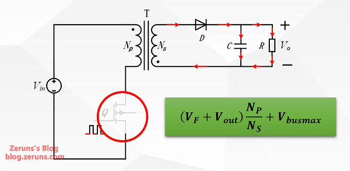 - When the MOSFET turns on, the secondary diode is reverse-biased, and the capacitor supplies power to the load, causing the output voltage to decrease and form output voltage ripple.