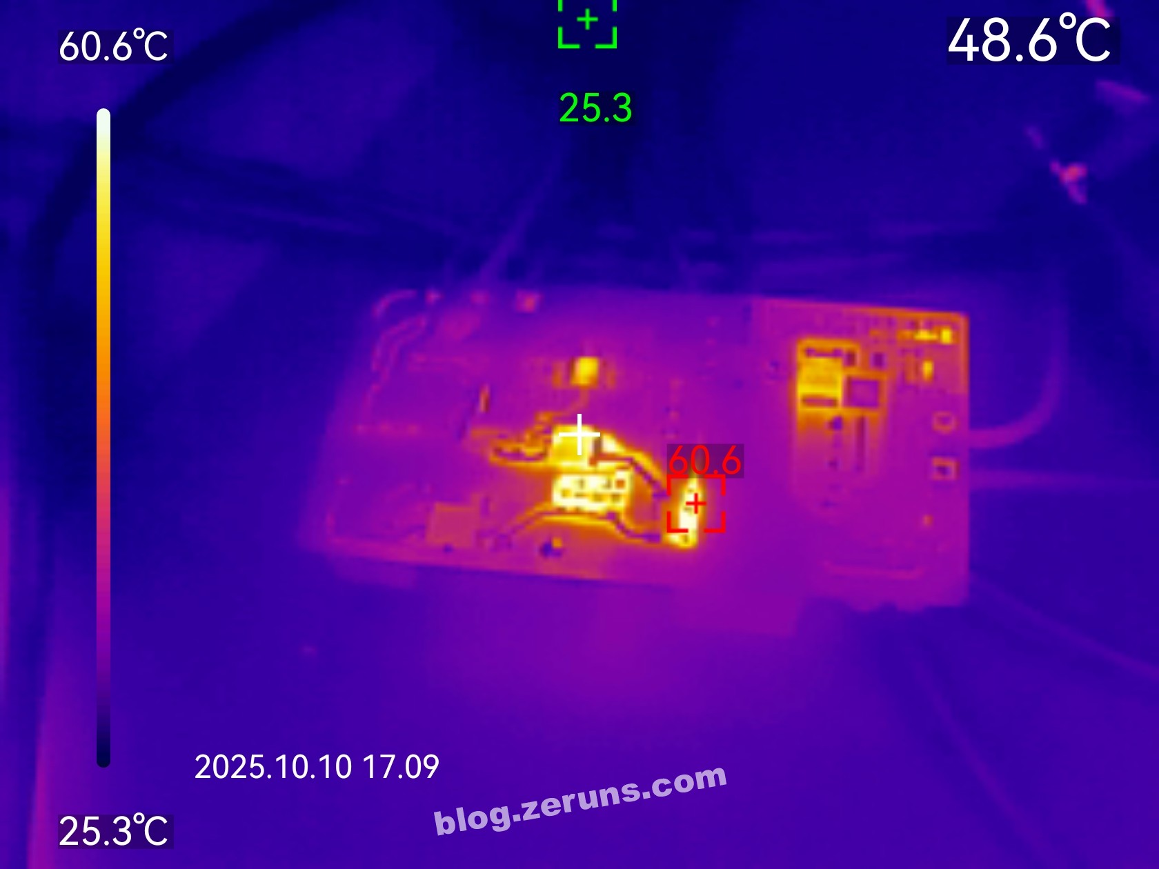 Hình ảnh nhiệt mặt dưới nguồn khi không tải. Vị trí nóng nhất nằm ở điện trở khởi động, nhiệt độ khoảng 60°C (nhiệt độ môi trường khoảng 25°C). MOSFET phía sơ cấp khoảng 48°C.