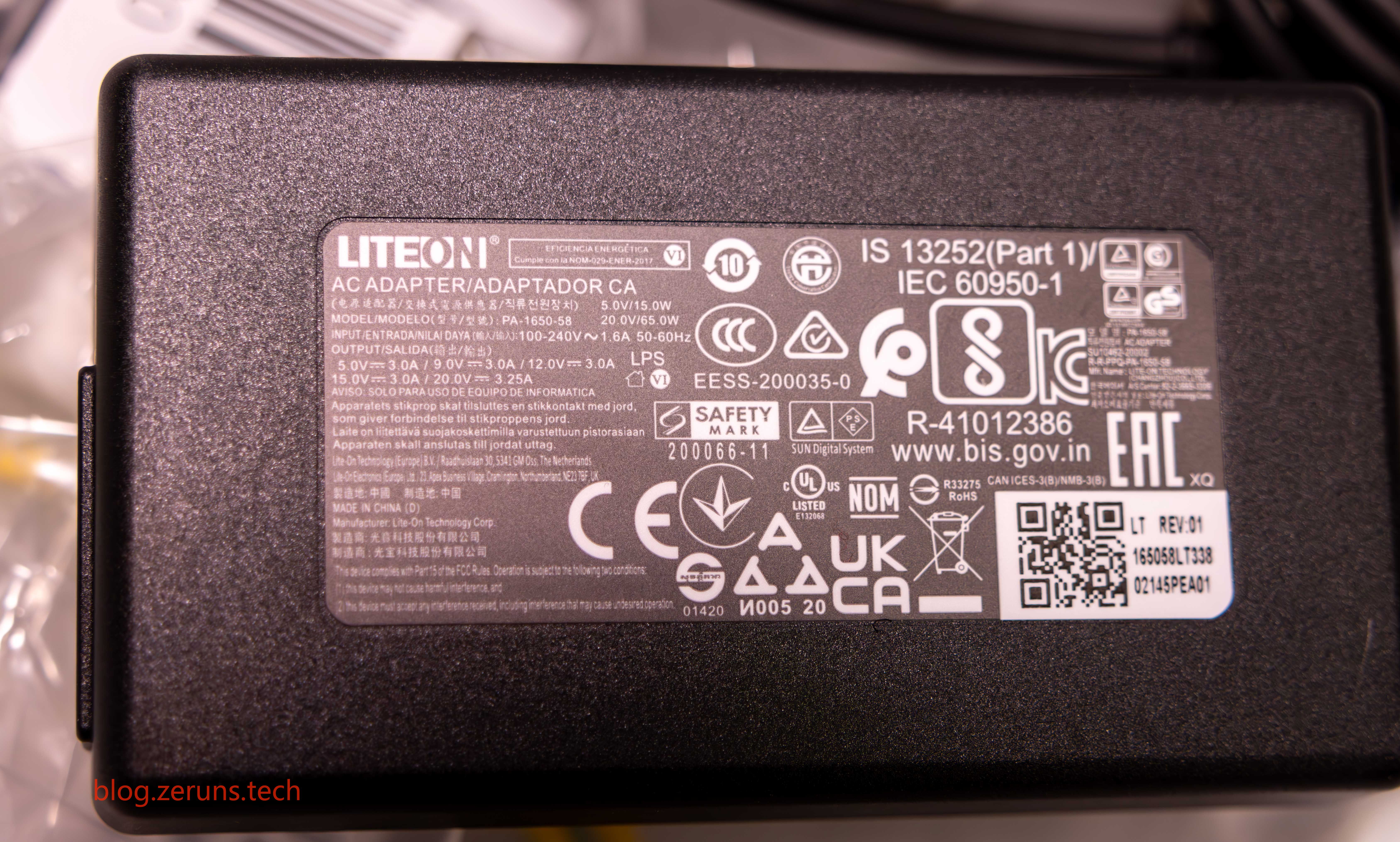 Блок питания LITEON (Liteon), модель PA-1650-58. Этот бренд является одним из известных производителей источников питания. Входной разъём — трёхштырьковый (форма «цветок сливы»), выход — разъём Type-C, поддержка протокола PD, максимальная мощность 65 Вт. Выход постоянного тока: 5 В/3 А, 9 В/3 А, 12 В/3 А, 15 В/3 А, 20 В/3,25 А. Диапазон входного напряжения: переменный ток 100–240 В.