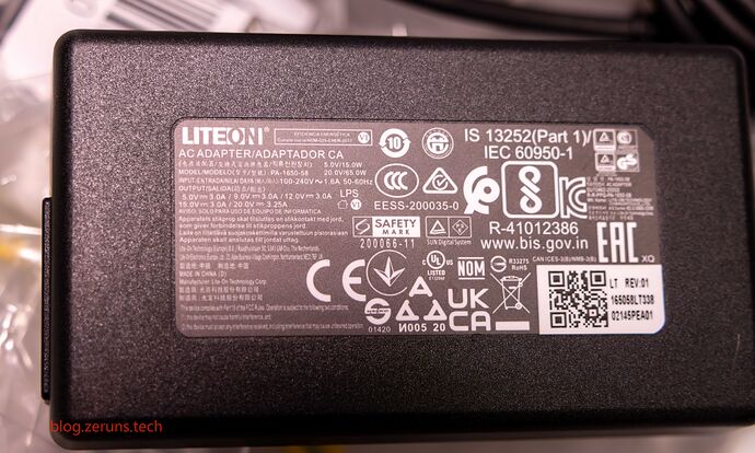 LITEON(光宝)的电源,型号PA-1650-58,这个品牌在电源里应该算是大品牌了,输入为三孔梅花型接口,输出为Type-C接口,支持PD协议,最大功率65W,可输出直流5V3A、9V3A、12V3A、15V3A、20V3.25A,输入电压范围交流100-240V。