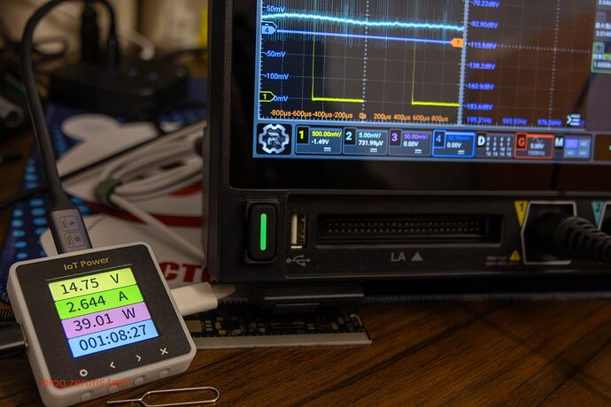 4通道全开+信号发生器打开+Math运算开启的情况下,示波器输入电流2.644A,功率39瓦左右。