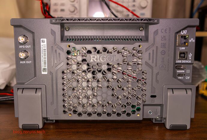 示波器背面,有函数发生器的输出接口、触发信号的输出接口,网口、USB接口、HDMI接口、Type-C供电接口、地线接口,以及还有VESA螺丝孔,可以接到屏幕支架上挂起来。