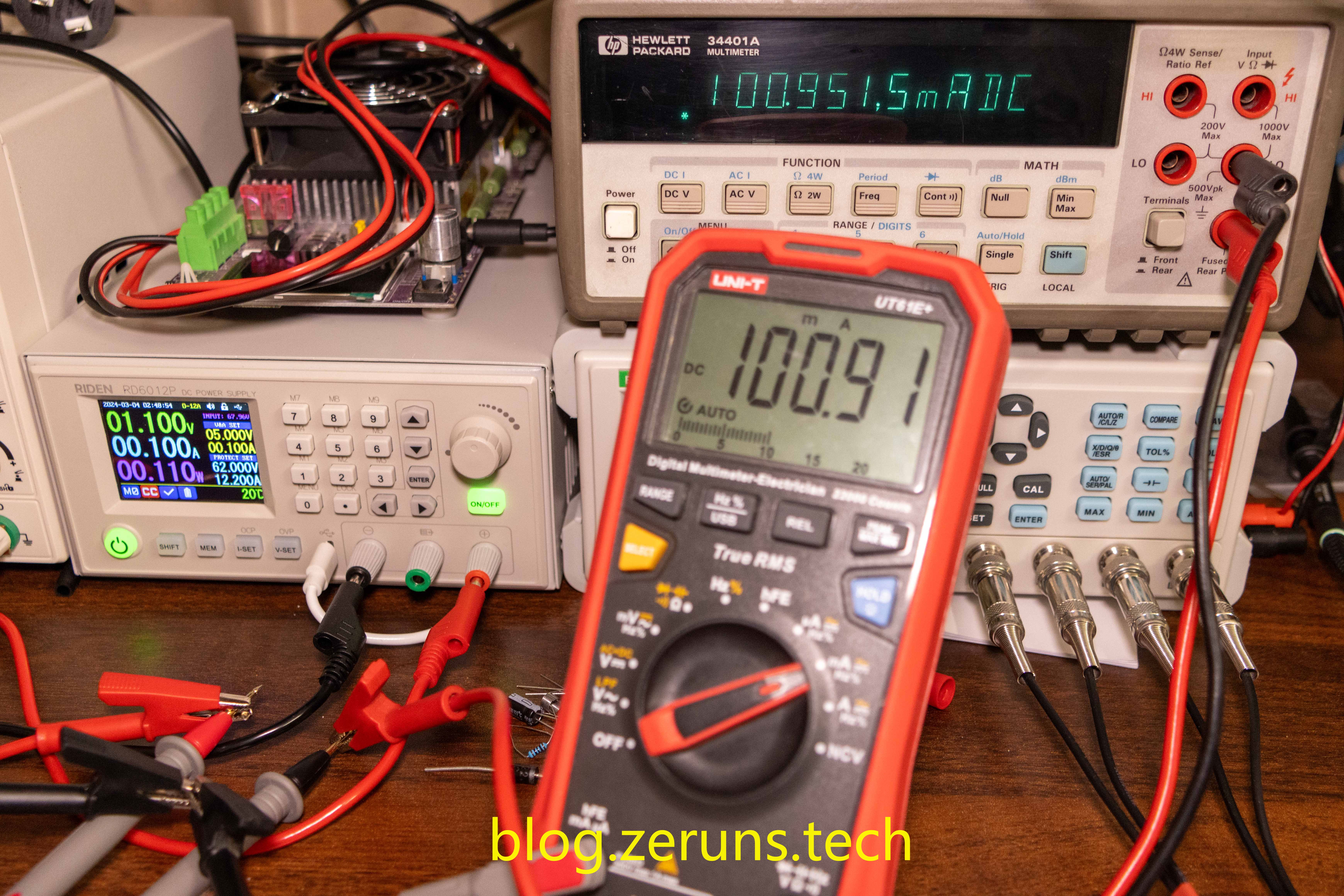 Cài đặt nguồn RD6012P đầu ra dòng hằng 0.1A, 34401A đo được 100.9515mA, UT61E+ đo được 100.91mA.