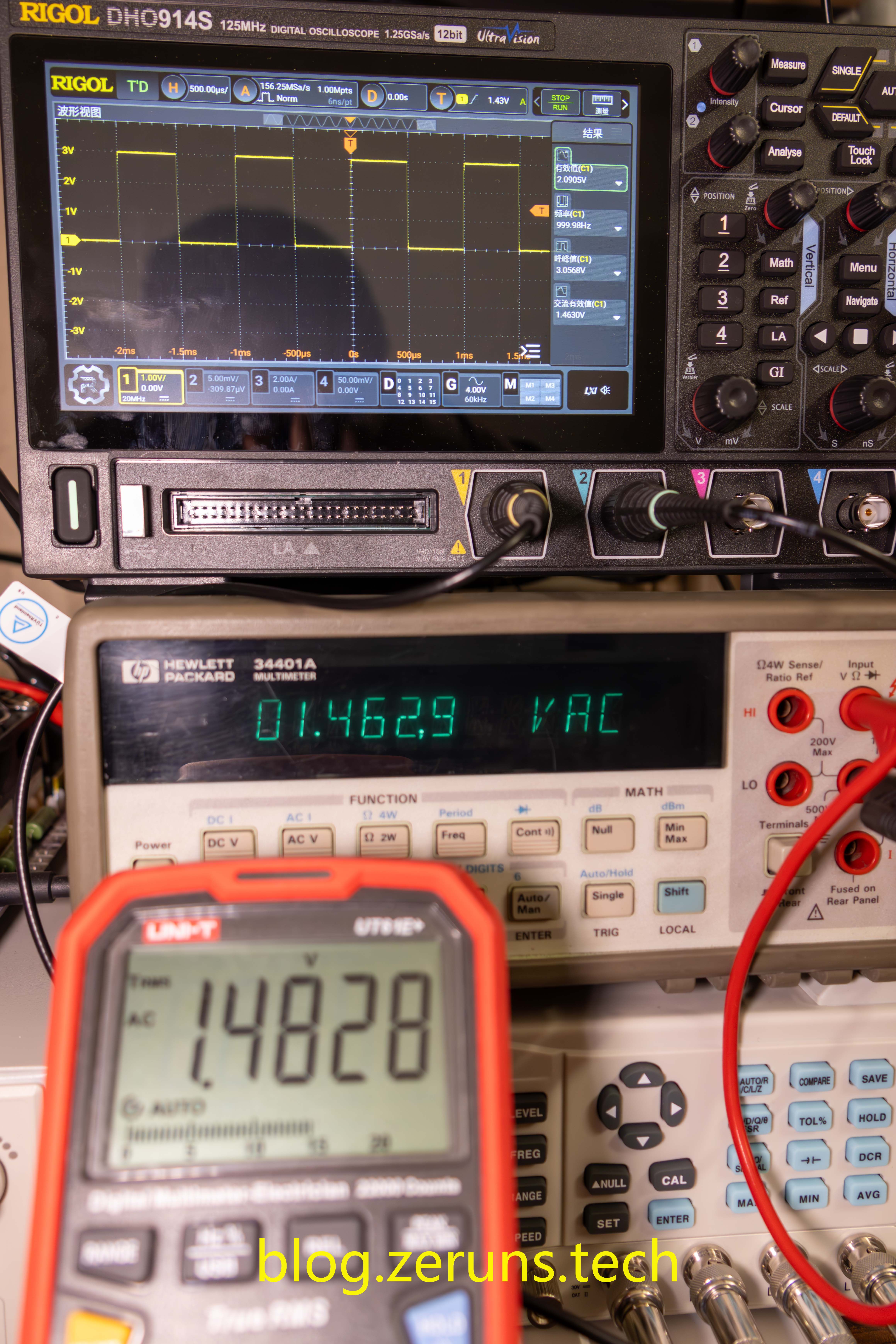Máy hiện sóng DHO914S phát ra sóng vuông tần số 1kHz, biên độ đỉnh-đỉnh 3V, máy hiện sóng đo được giá trị hiệu dụng AC là 1.4630V, 34401A đo được 1.4629V (quên cài đặt số chữ số), UT61E+ đo được 1.4828V.