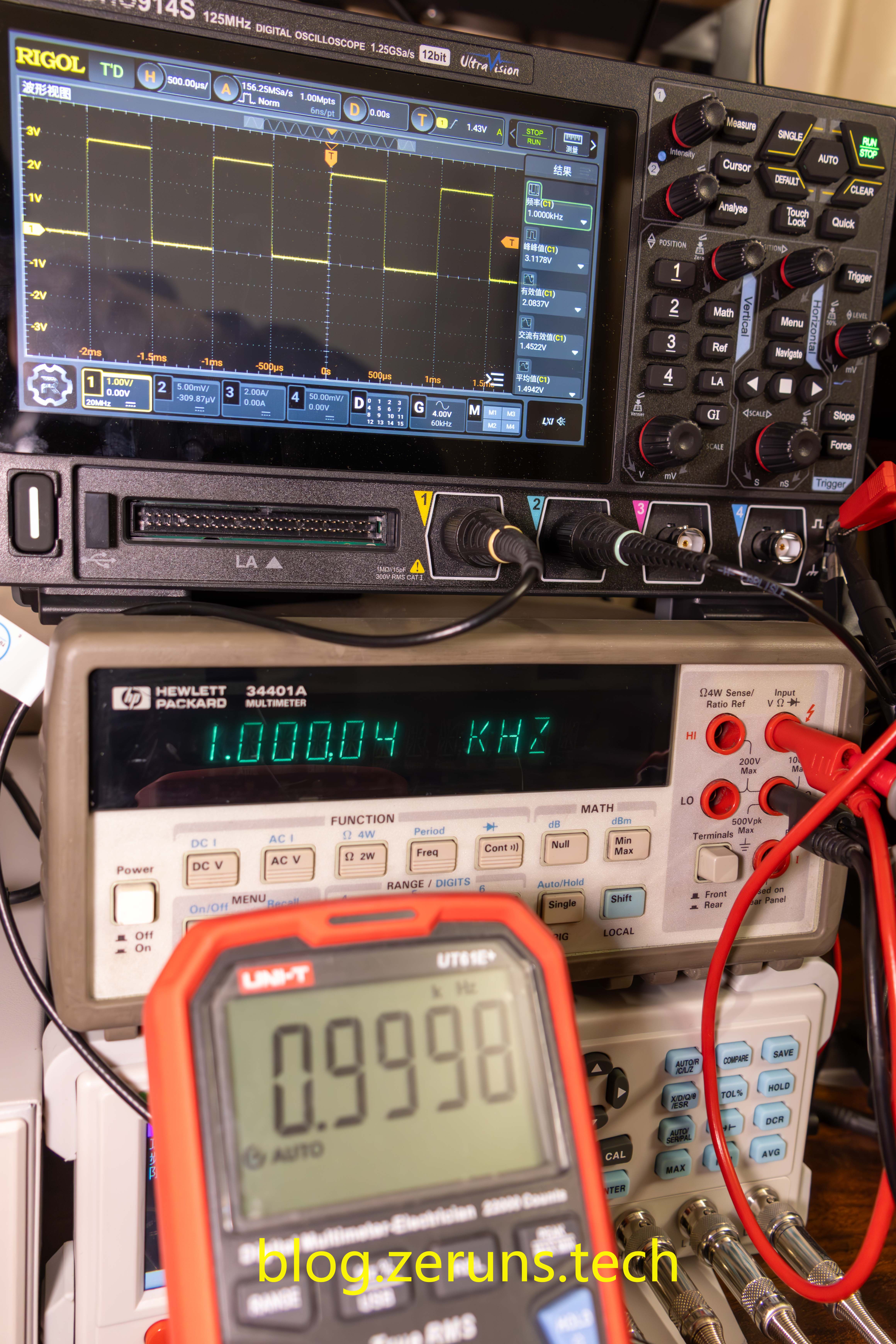Máy hiện sóng DHO914S phát ra sóng vuông 1kHz, máy hiện sóng đo được tần số 1kHz, 34401A đo được 1.00004kHz, UT61E+ đo được 0.9998kHz.