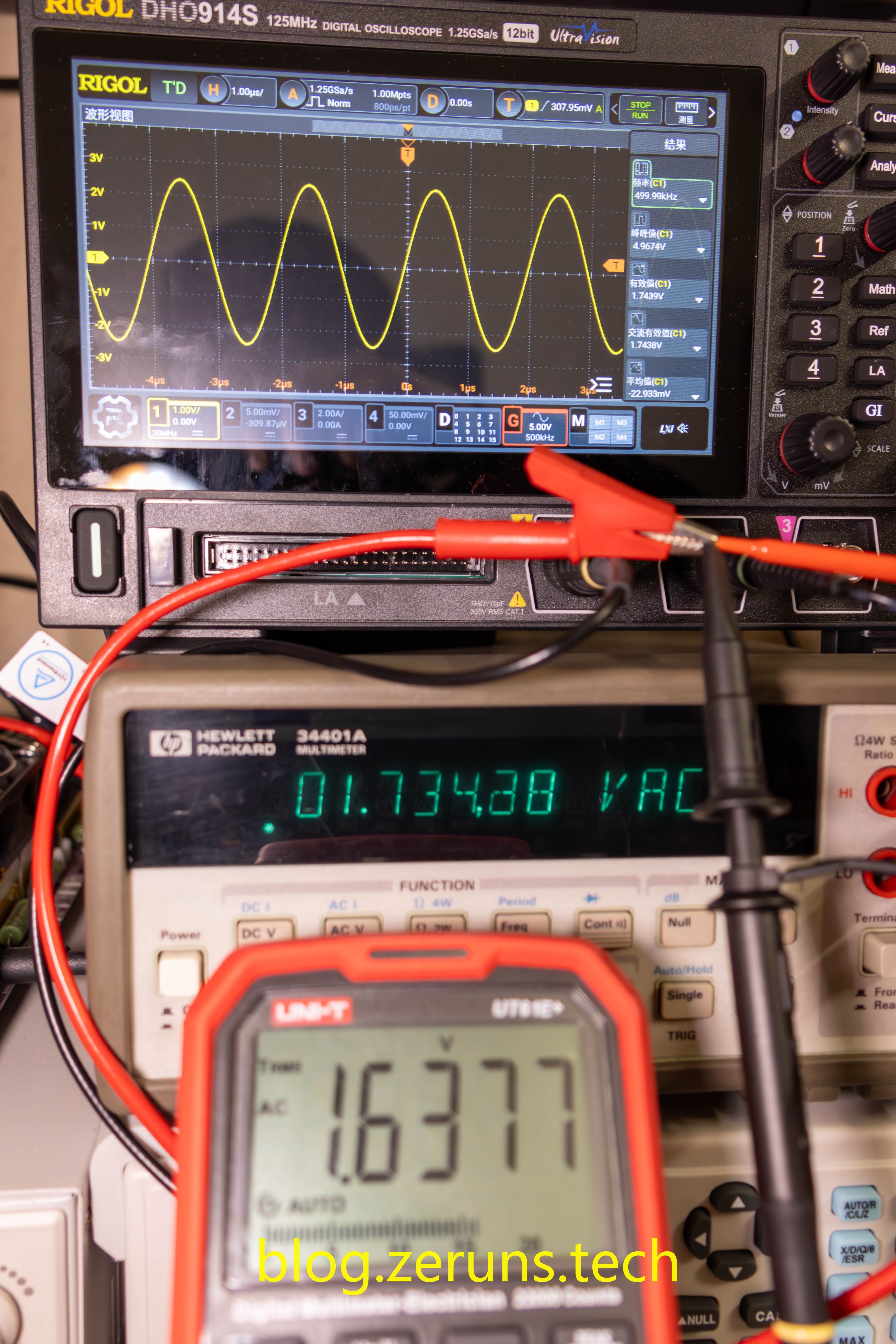 Máy hiện sóng DHO914S phát ra sóng sin tần số 500kHz, biên độ đỉnh-đỉnh 5V, máy hiện sóng đo được giá trị hiệu dụng AC là 1.7438V, 34401A đo được 1.73428V, UT61E+ đo được 1.6377V.