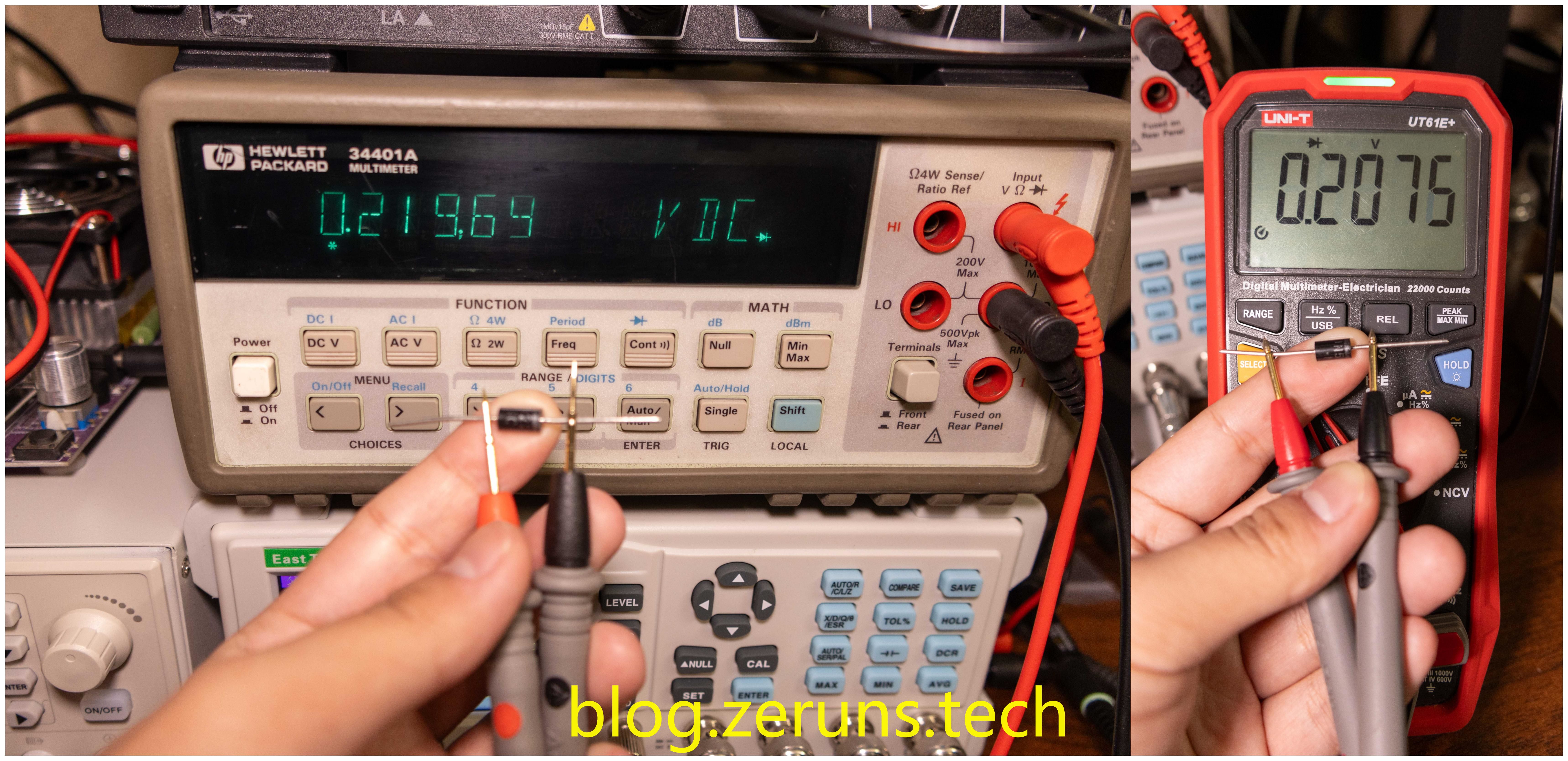 Kiểm tra điốt model 1N5822, 34401A đo được 0.21964V, UT61E+ đo được 0.2075V.