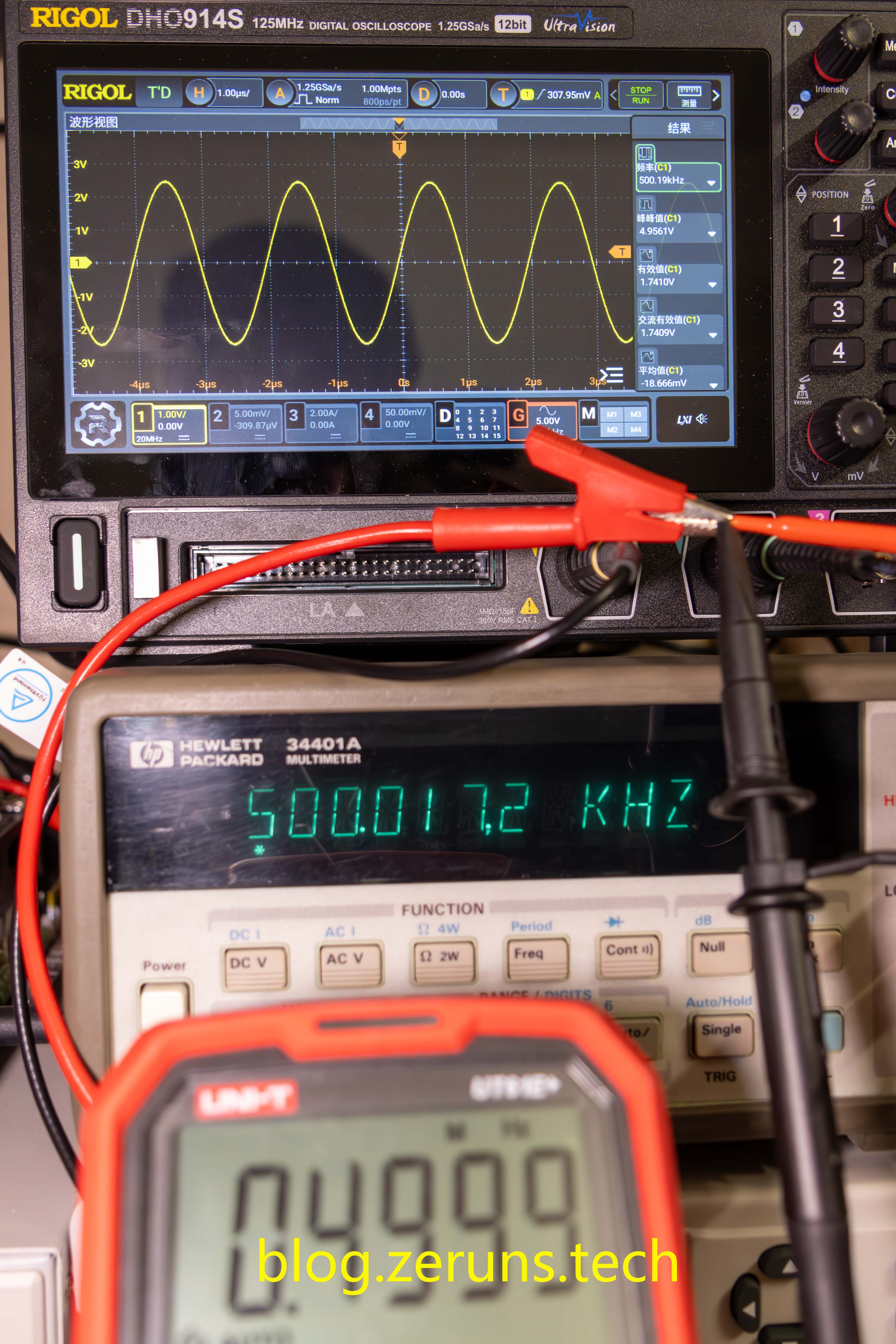 Máy hiện sóng DHO914S phát ra sóng sin 500kHz, máy hiện sóng đo được tần số 500.19kHz, 34401A đo được 500.0172kHz, UT61E+ đo được 0.4999MHz.