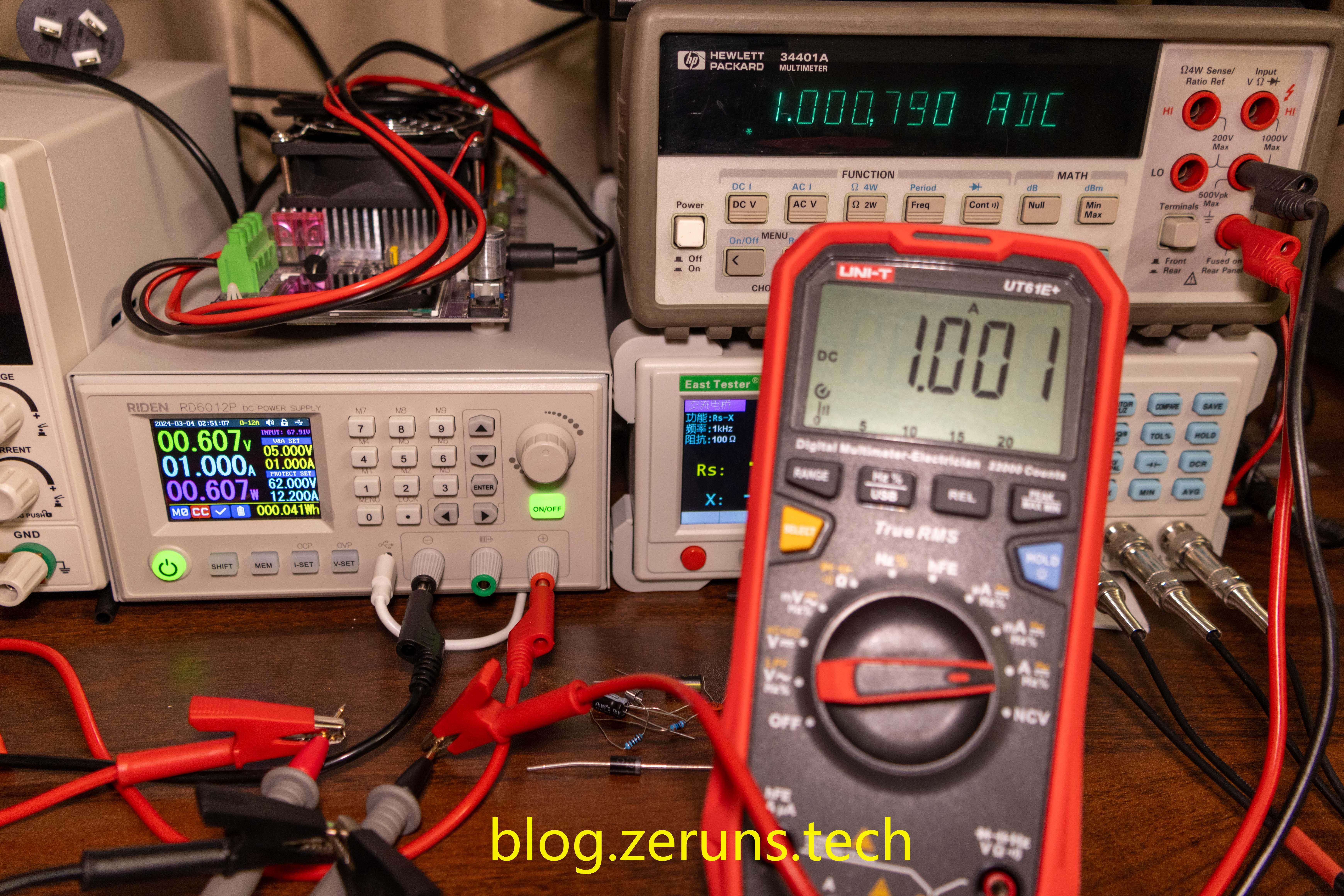 Cài đặt nguồn RD6012P đầu ra dòng hằng 1A, 34401A đo được 1.000790A, UT61E+ đo được 1.001A.