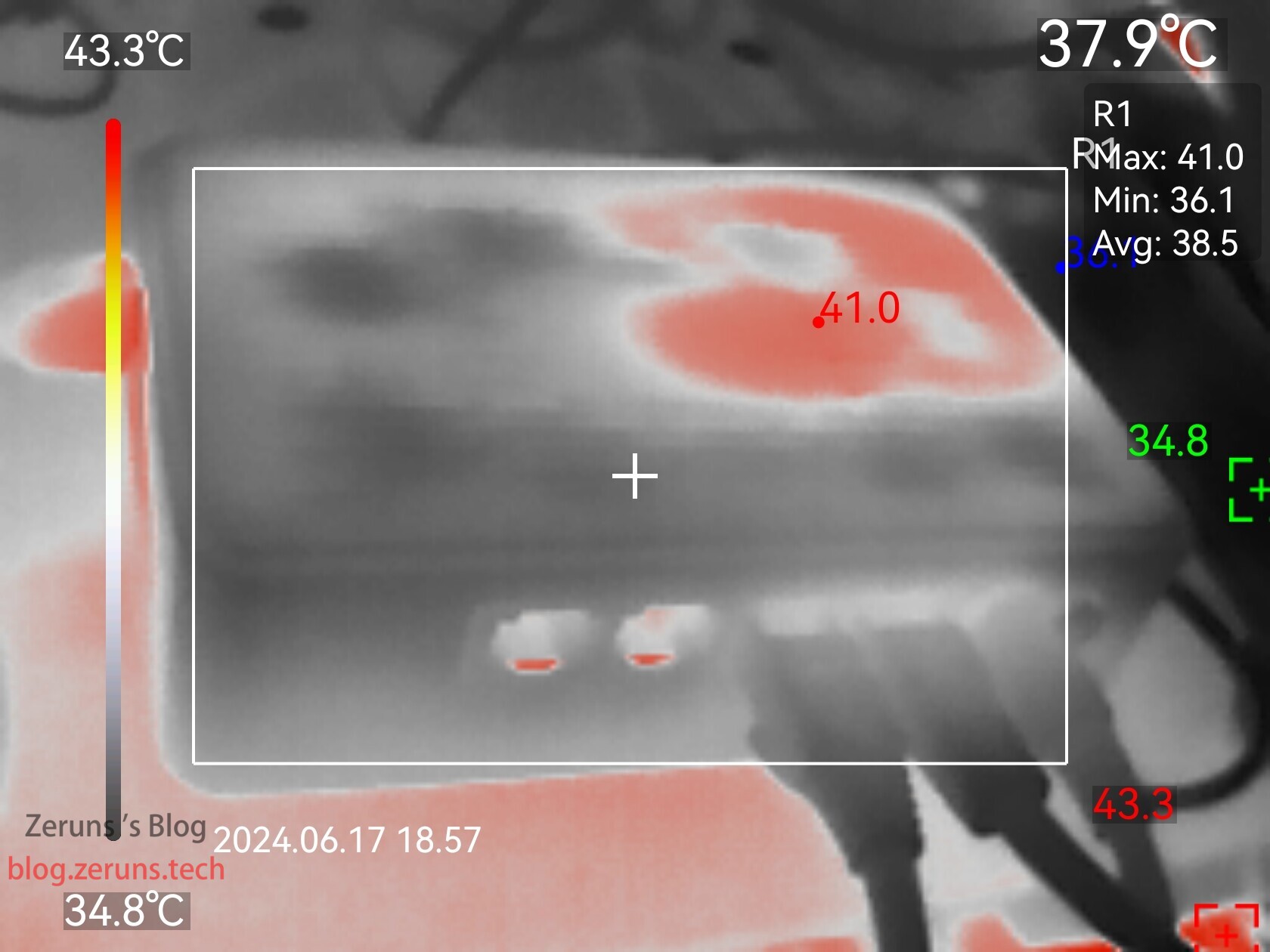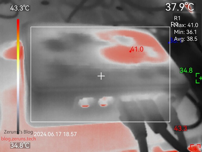 下面这张是移动的吉比特H50G光猫的热成像图像,没有加风扇,顶盖只有小部分面积在40度以上,最高点41度: