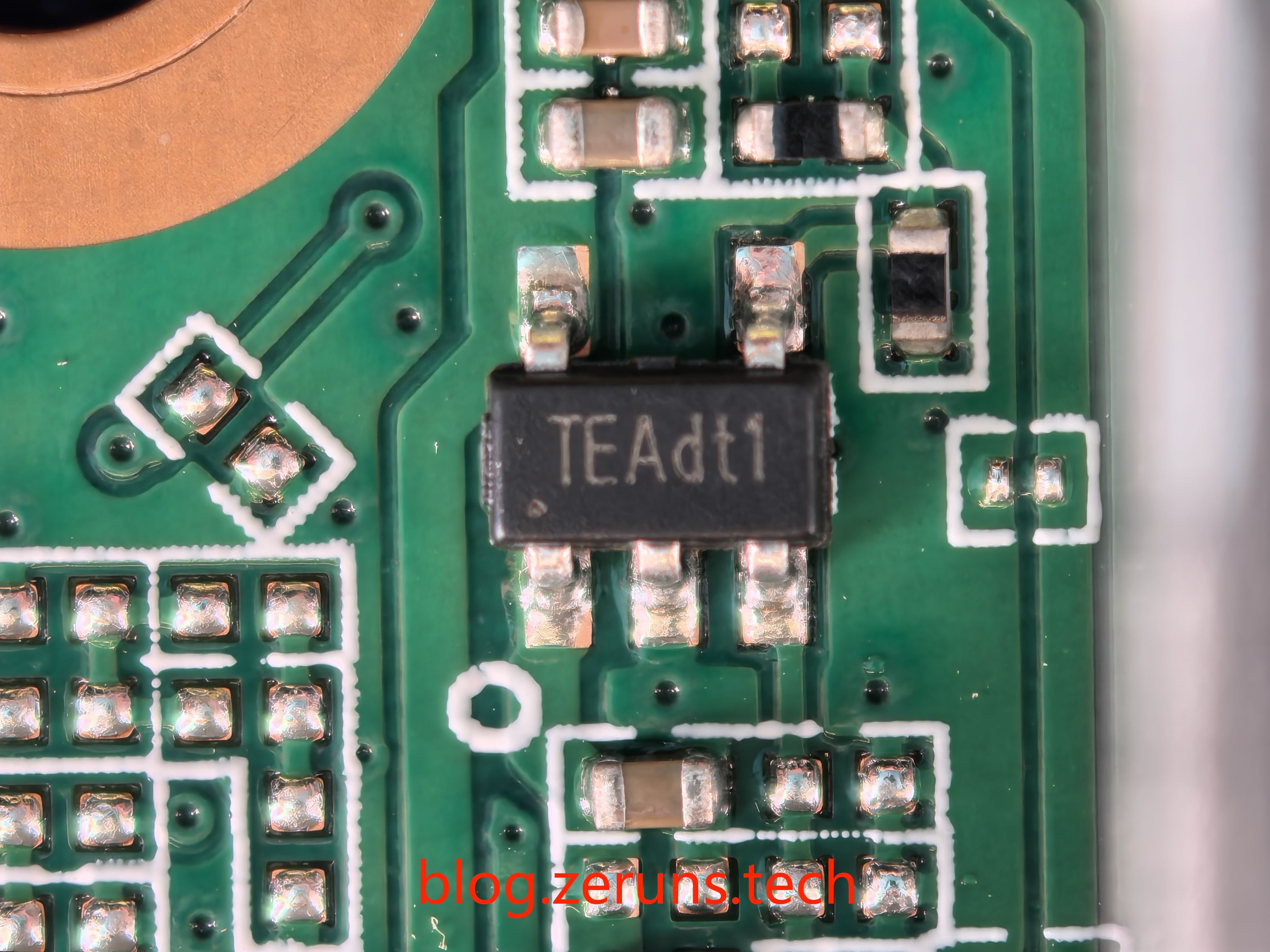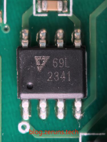 拆开顶盖,可以看到电路板底面,有一颗型号开头为HYF2G的芯片,应该是江苏扬贺扬公司的NAND Flash芯片,用来存储固件的,容量应该是2Gbit(256MByte)。