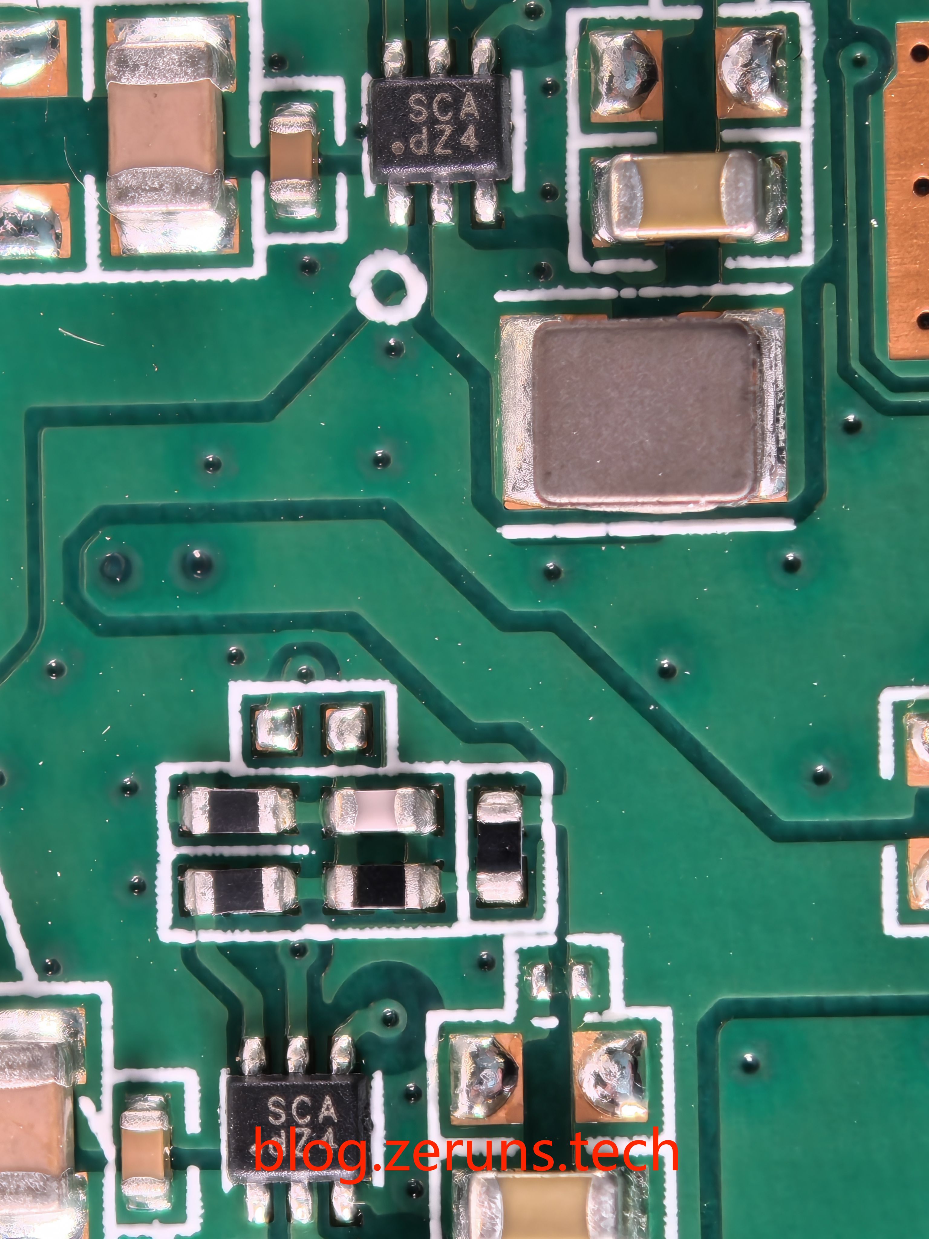 电路板中间最大的芯片是光猫的SOC,型号为ZXIC ZX279133,中兴微电子自研的芯片,基于中芯国际14nm制程打造,双核A53架构,双核心的CPU与八核心的NPU,组成了10核心的自研主芯片。