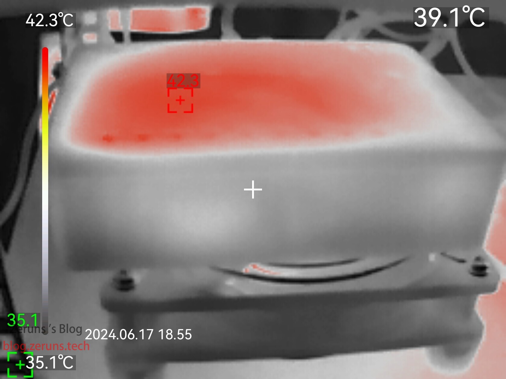 下面这张是中兴的F7015TV3加散热风扇后的热成像图像,顶盖大部分面积40度以上,最高点42.3度:
