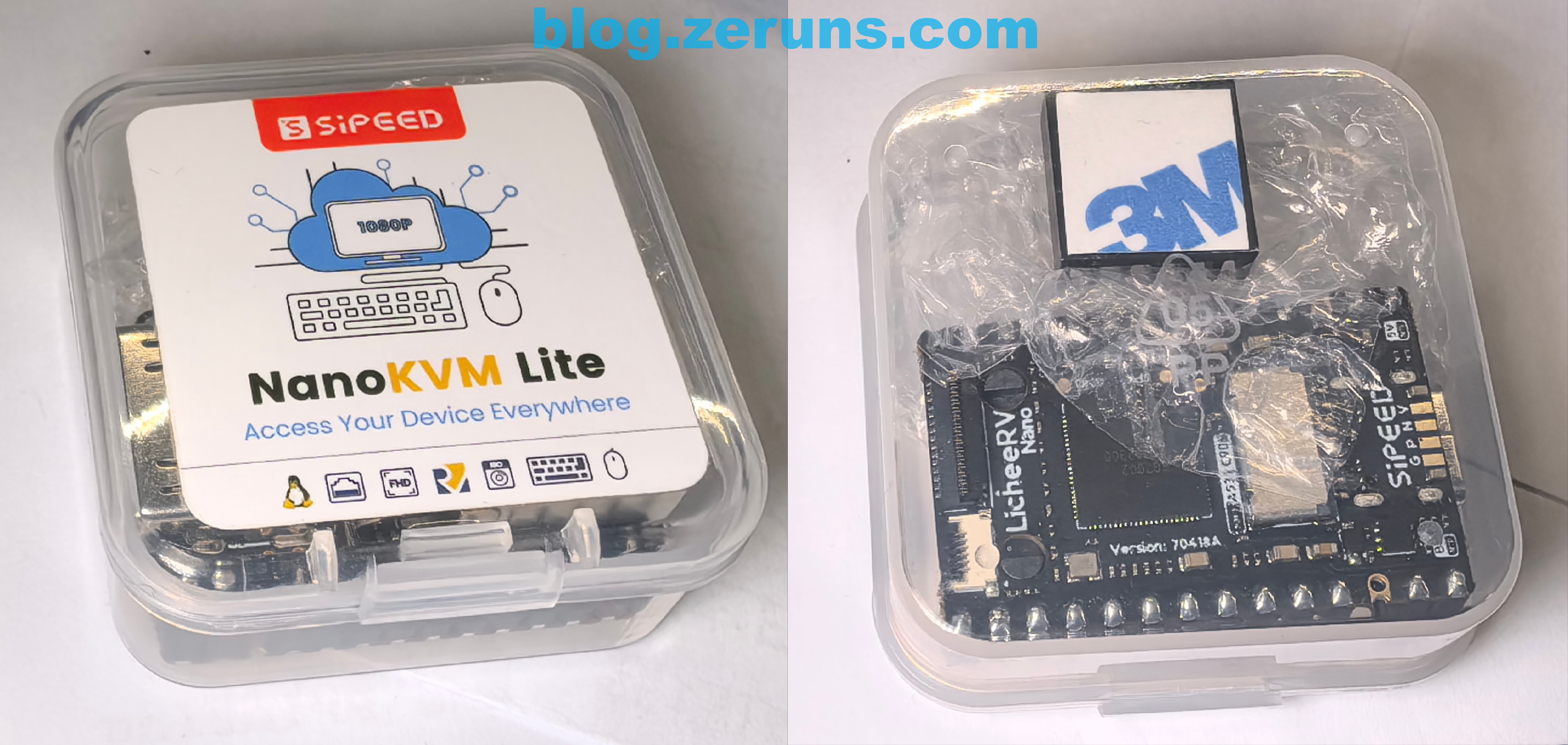 He comprado tanto la versión Lite como la Full. La siguiente imagen muestra la versión Lite, empaquetada en una pequeña caja transparente que contiene el NanoKVM y una disipador con adhesivo térmico.