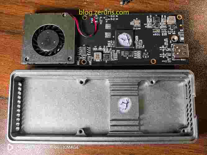 拆下硬盘盒电路板,板上有一个小风扇,还有各种芯片,主芯片上有导热膏