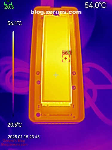 读写跑满时硬盘正面热成像图如下,最高温度56.1℃左右(环境温度20度左右)。发热表现还不错