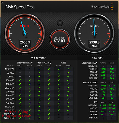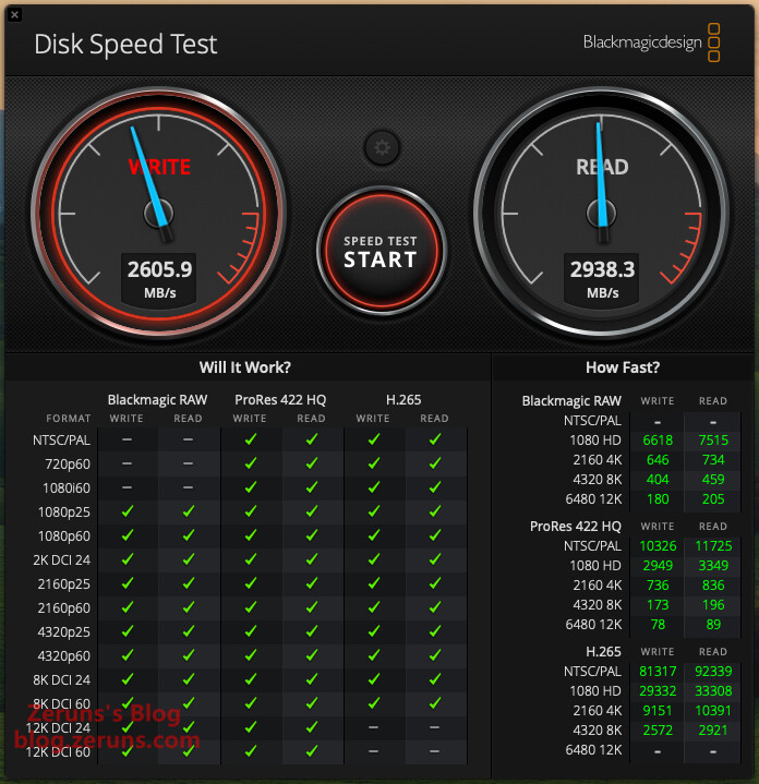 使用Mac上的 Blackmagicdesign Disk Speed Test 软件测速,顺序写入速度2605.9MB/s,顺序读取2938.3MB/s(受限硬盘盒和接口速率,跑不满硬盘的速度)