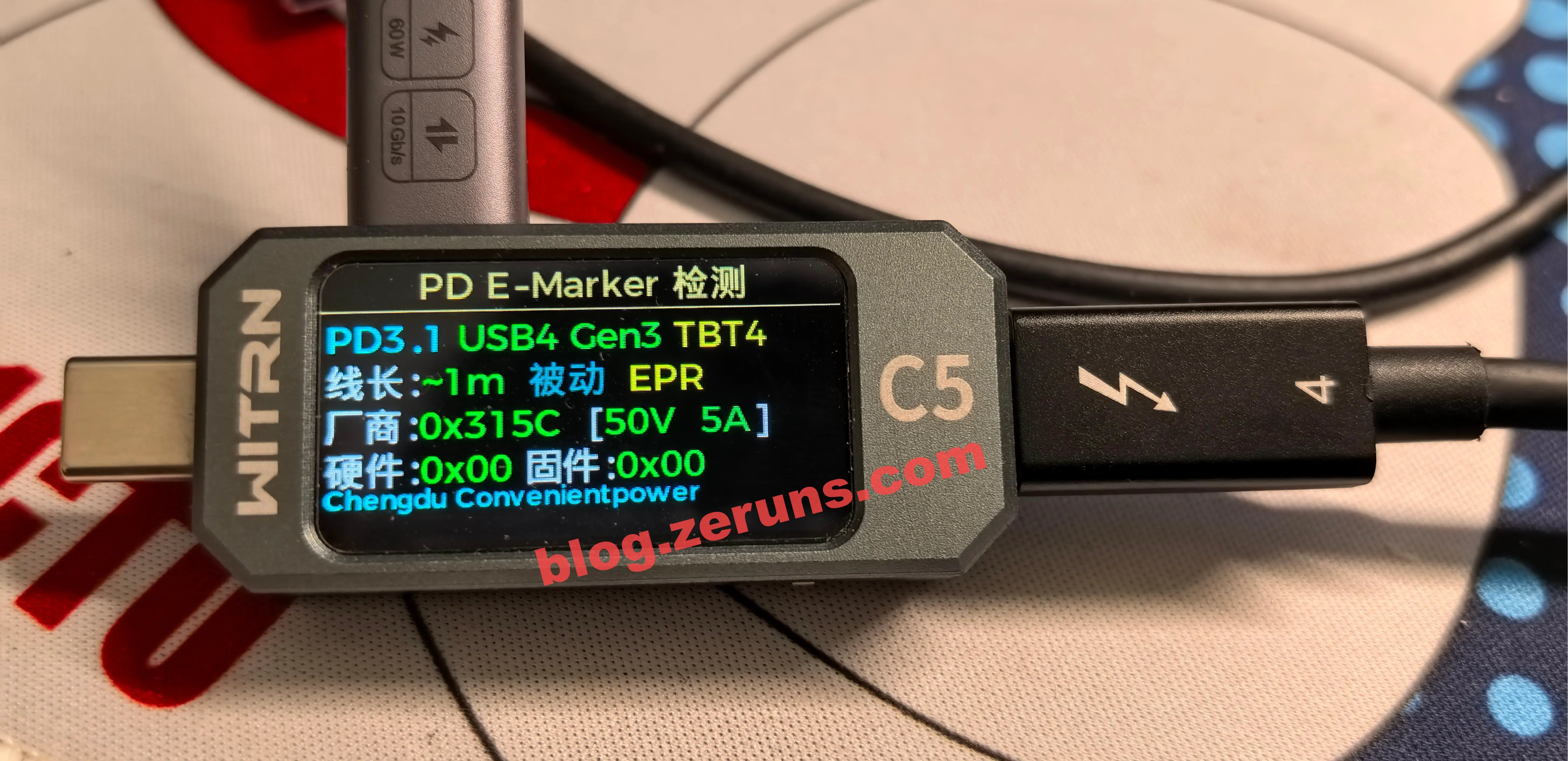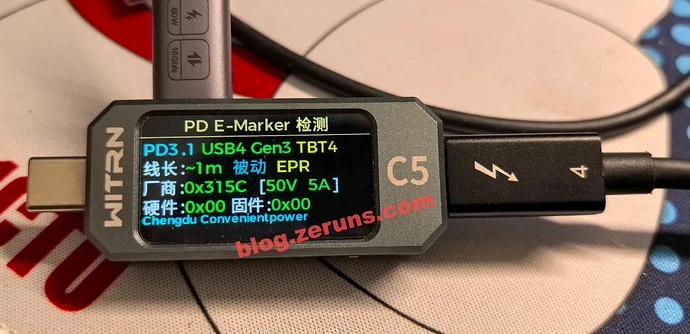使用 维简C5检测仪 读取硬盘盒附赠的数据线的E-Marker信息,信息显示该数据线支持 USB4Gen3/TBT4(雷电4),厂商代码0x315C,支持PD3.1 EPR 50V 5A。