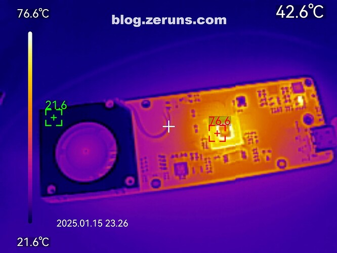 接上硬盘,连接电脑,在没有散热片情况下硬盘盒空载(没有数据传输)时的热成像图如下,主芯片温度直冲76℃,还在上升。(环境温度20度左右)