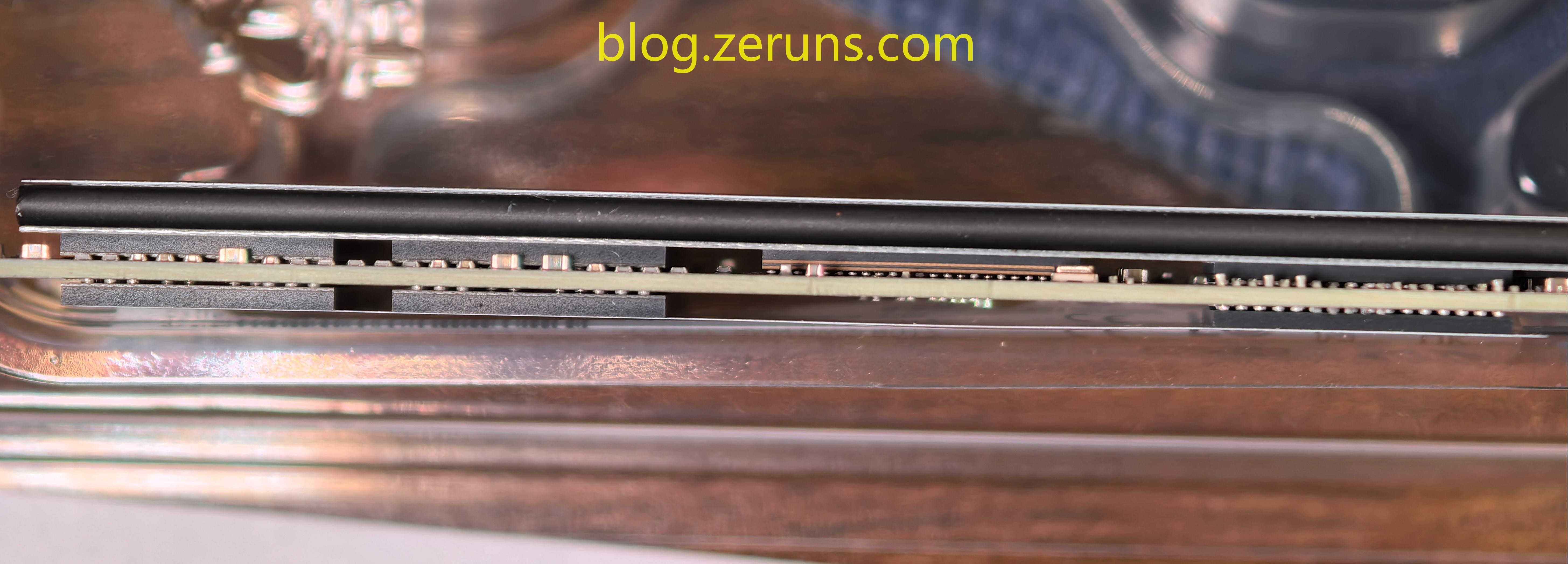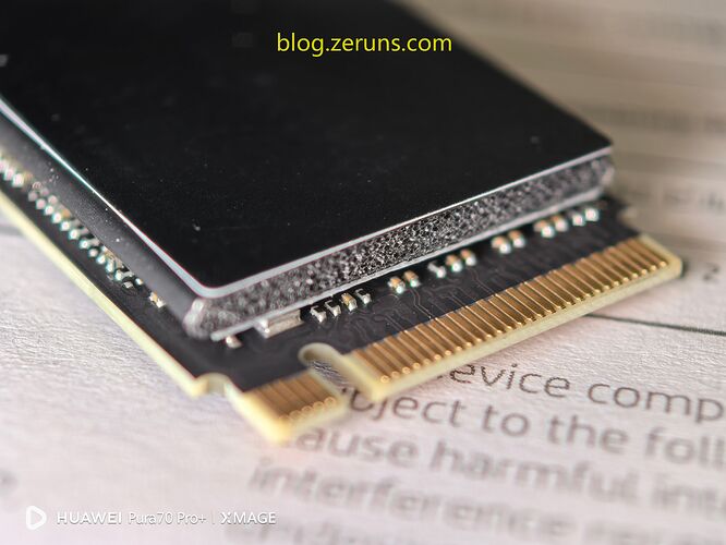 硬盘接口细节图,可以看到石墨烯散热贴从底下绕着中间的泡棉延伸到上面,使散热面积增加了,但也使硬盘厚度增加了